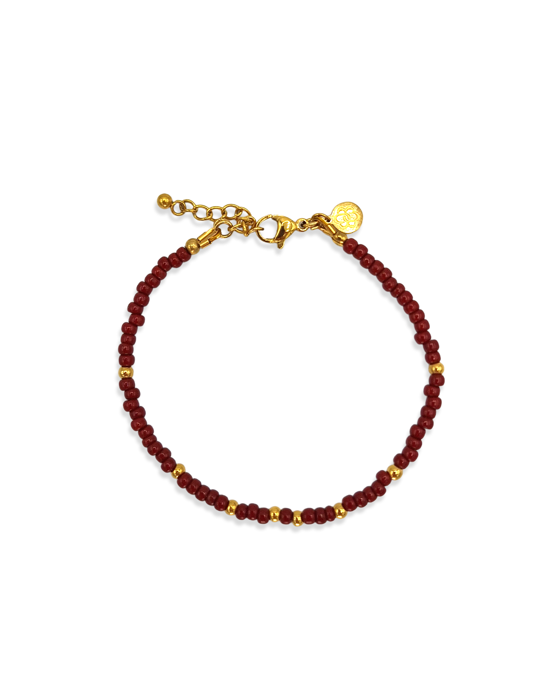 Een subtiel accent in diepe bordeauxkleur. De kleine kraaltjes geven een rustige, elegante lijn. De gouden details zorgen voor warmte en maken dit een ideale layering piece. Perfect voor feestdagen en dagelijks gebruik.