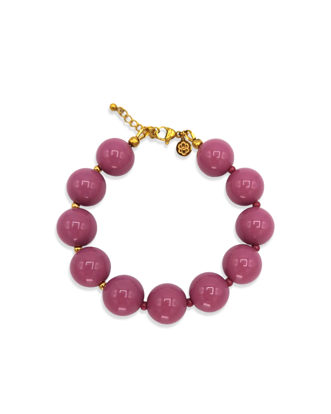 Een krachtig statement piece in zachte mauve tint. De grote glanzende kralen zorgen voor een clean, modern effect. Perfect voor avonden waarop je je look warm en opvallend wilt maken.