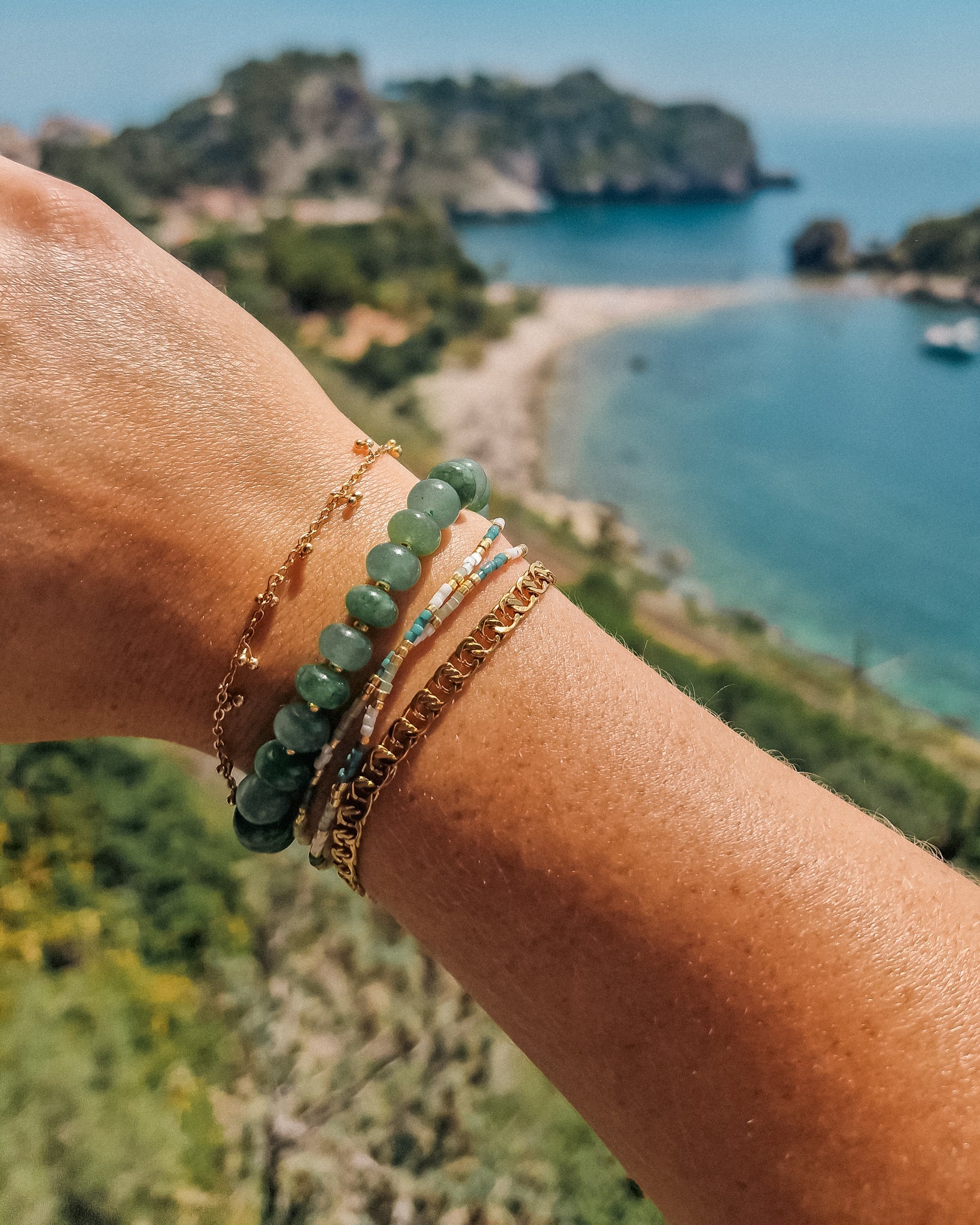 Bracelet with semi-precious stone/natural stone beads and small glass beads in green mix color. Perfect to combine with the Candy necklaces!