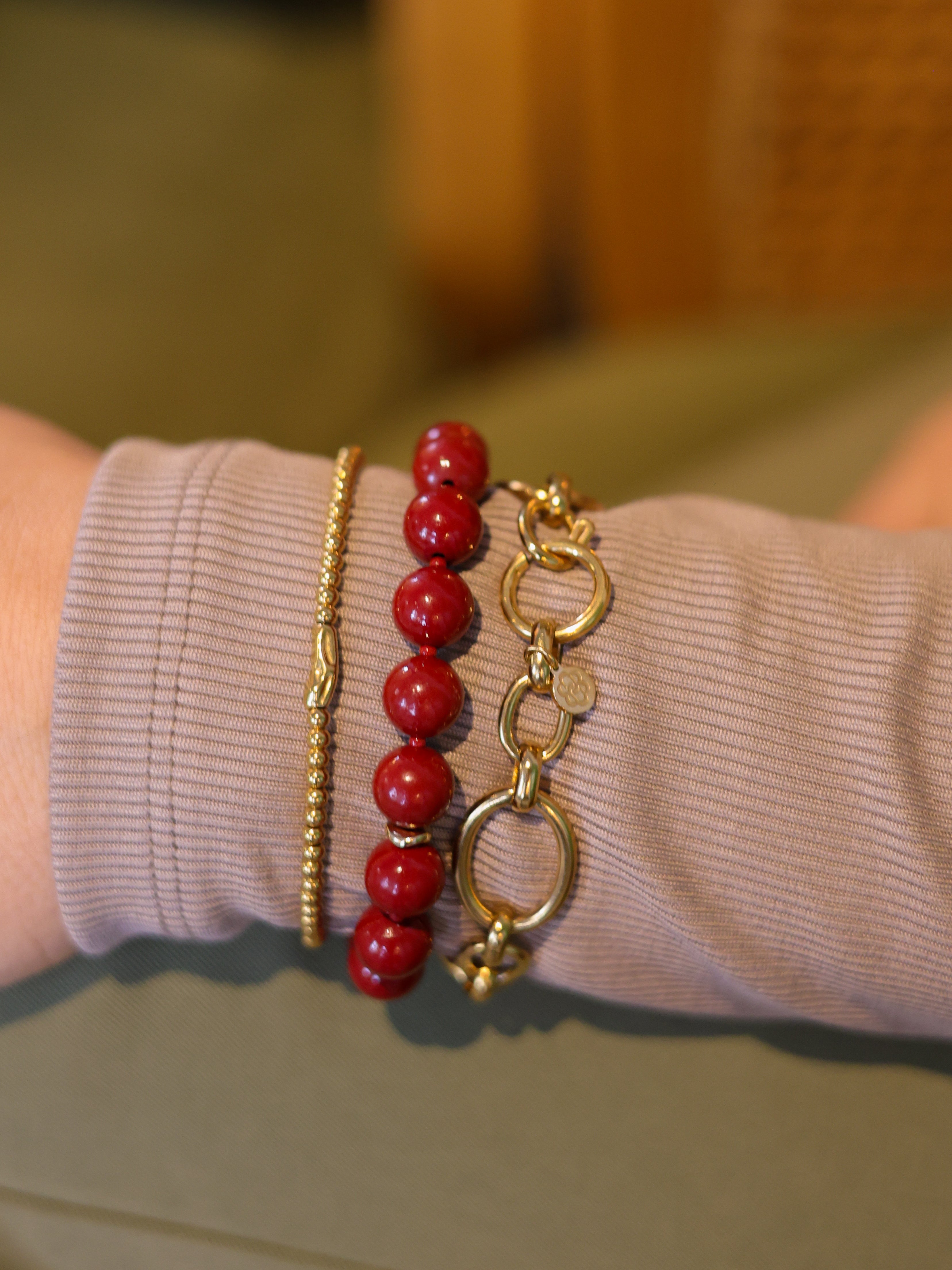 De Armband Deep Red Classic is ontworpen voor wie houdt van eenvoud met impact. De ronde kralen in diep rood geven een krachtige, warme uitstraling, terwijl de goudkleurige details het geheel verfijnd maken. Lichtgewicht, comfortabel en makkelijk te combineren met andere sieraden uit The Sculpt Edit.