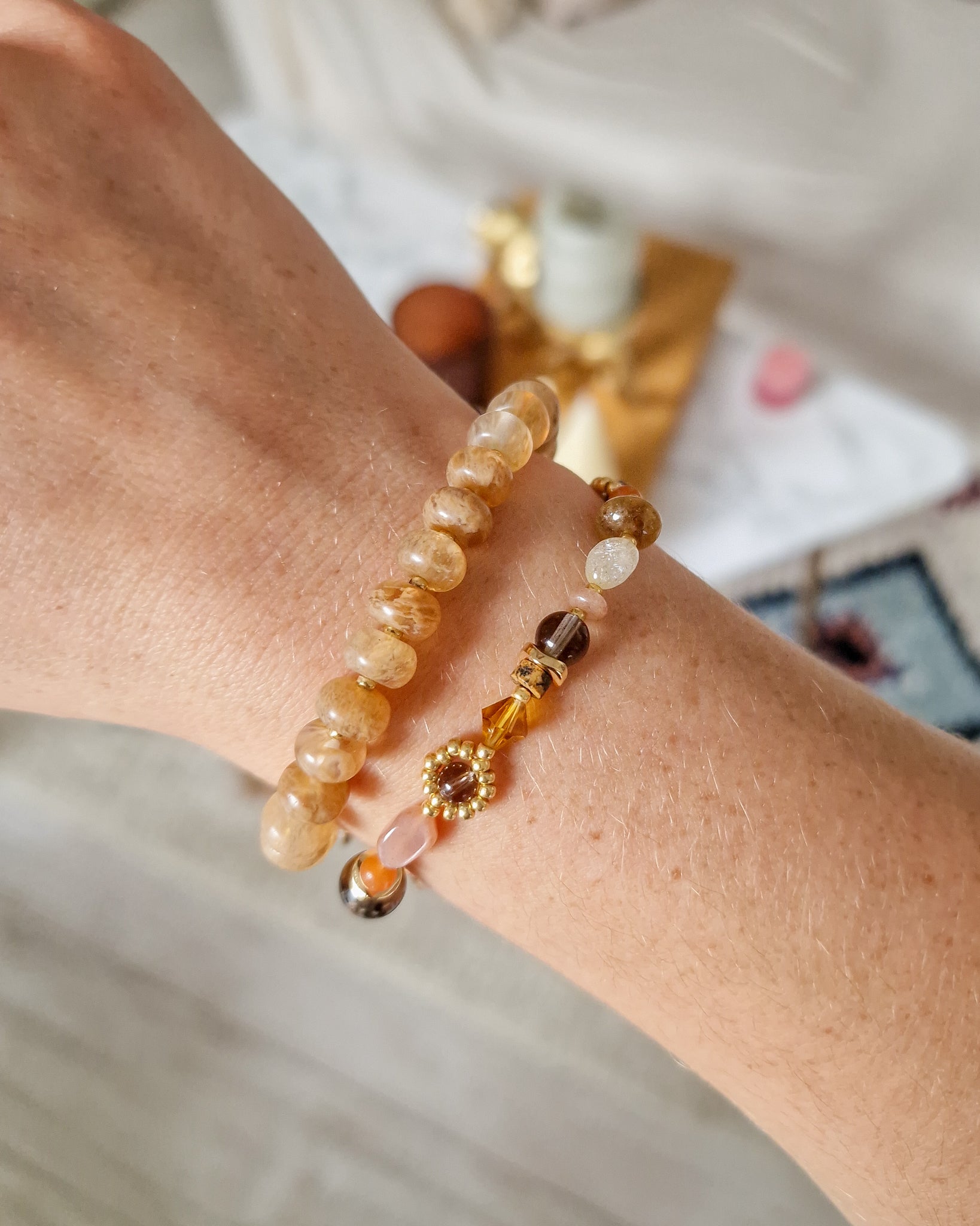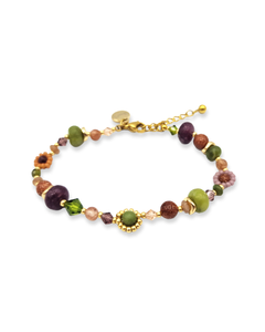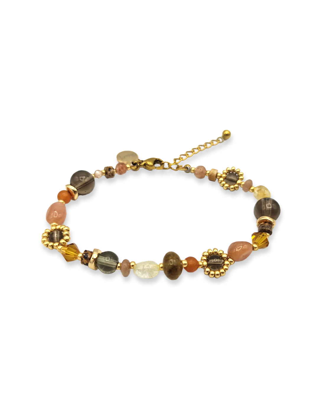 Made from a beautiful mix of natural stone beads, Swarovski bicones and handmade flowers, this bracelet exudes timeless elegance. With its comfortable fit and durable stainless steel, this bracelet is perfect for everyday use. Each piece is handmade in the Netherlands for a unique and personal touch!