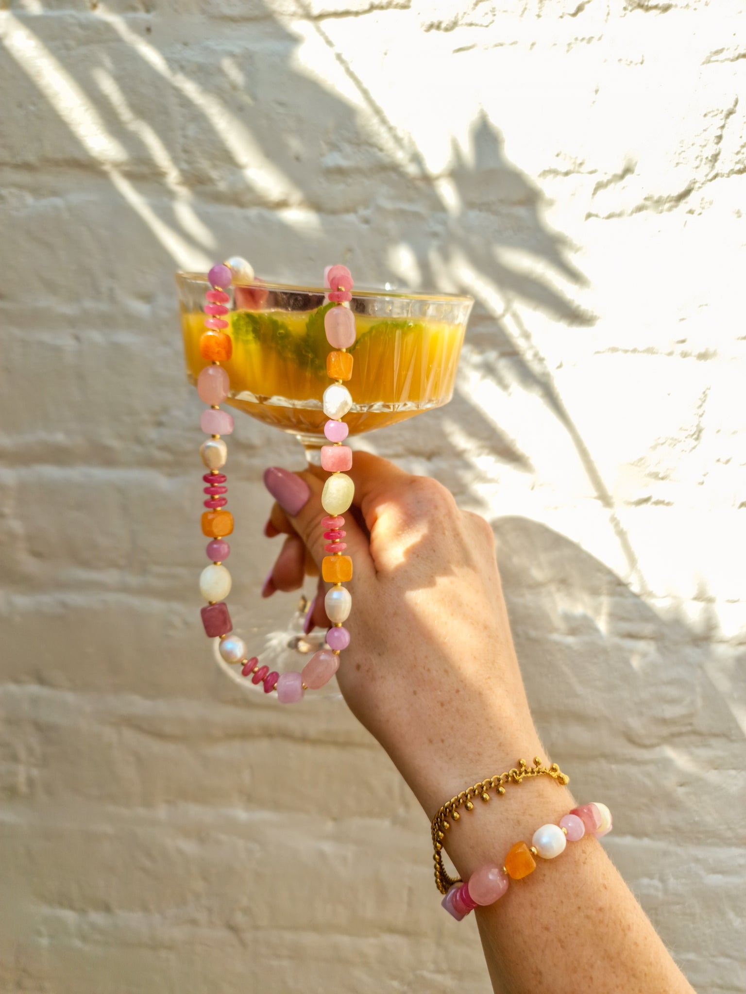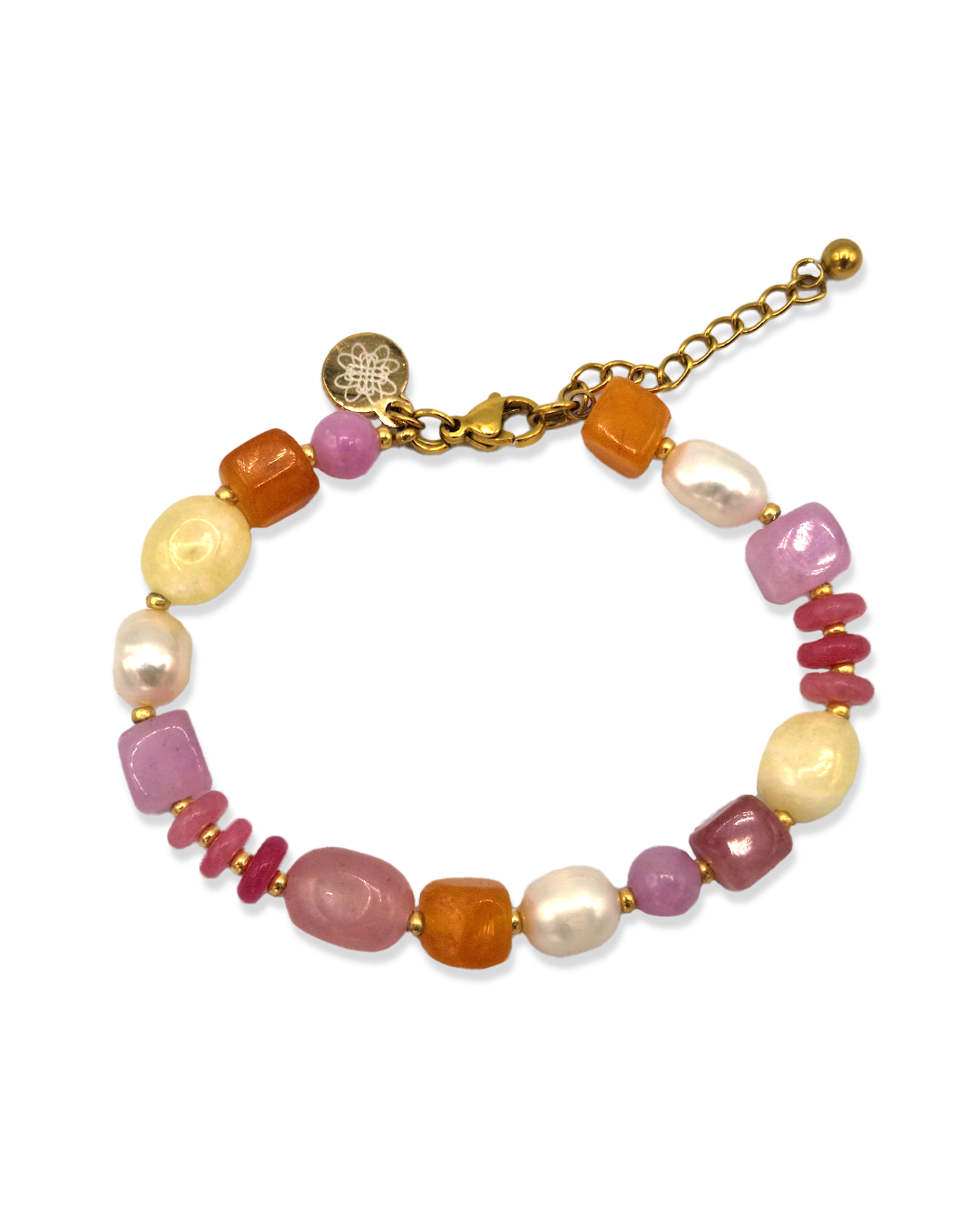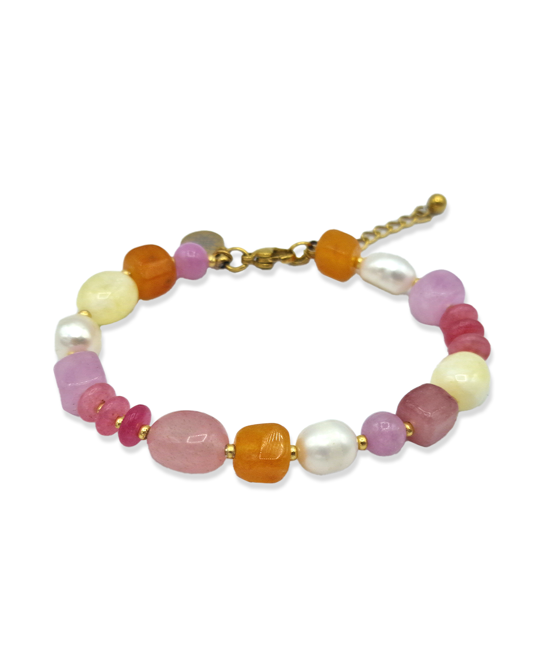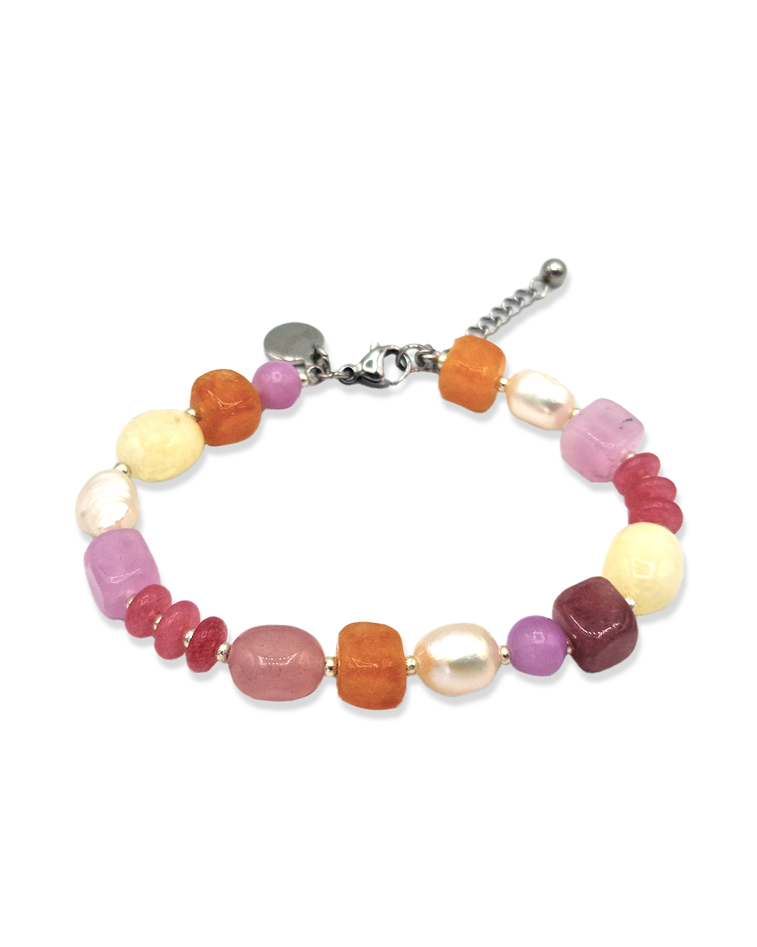 Necklace with natural stone beads and small glass beads in lilac, orange and pink color.