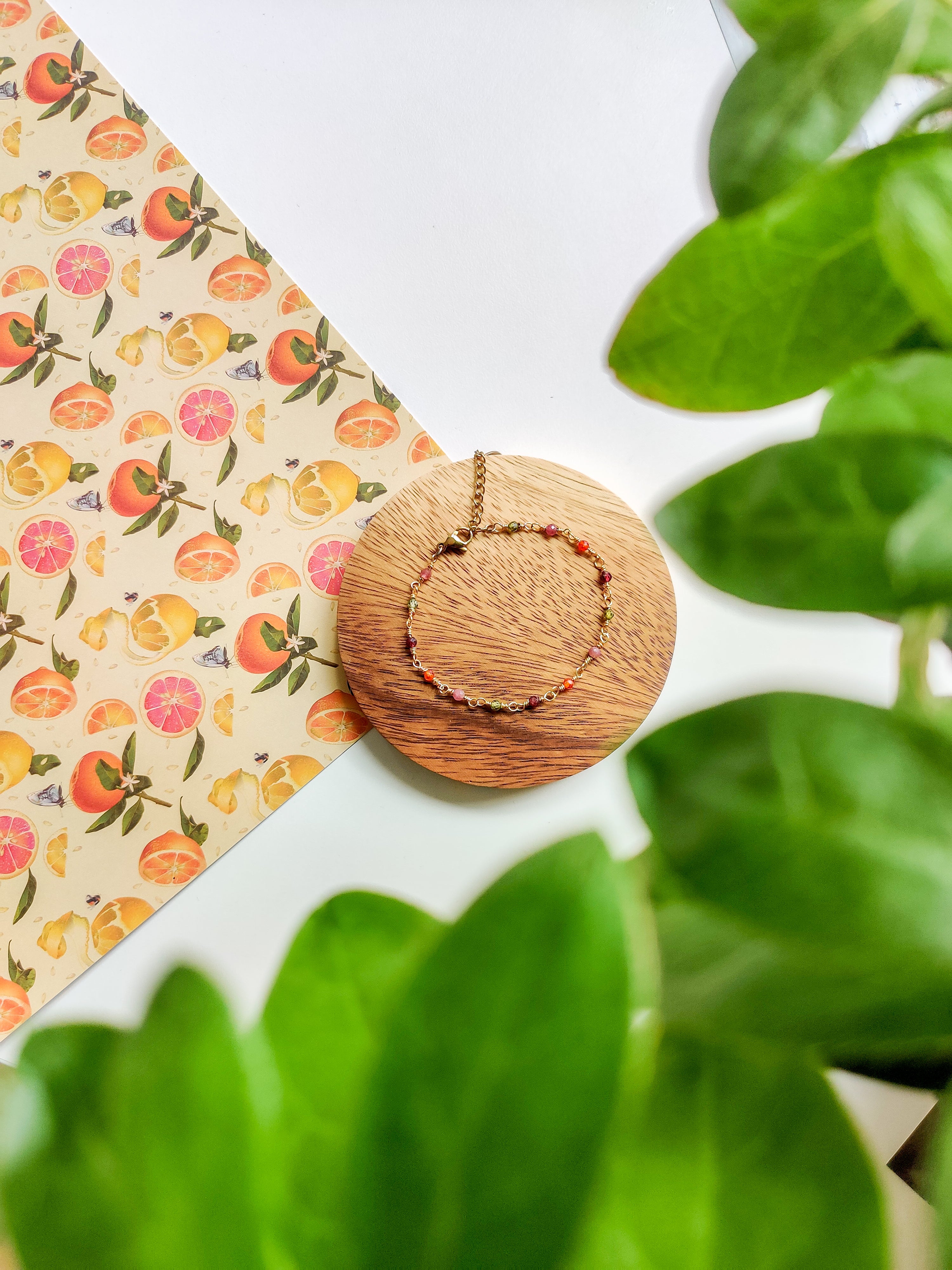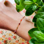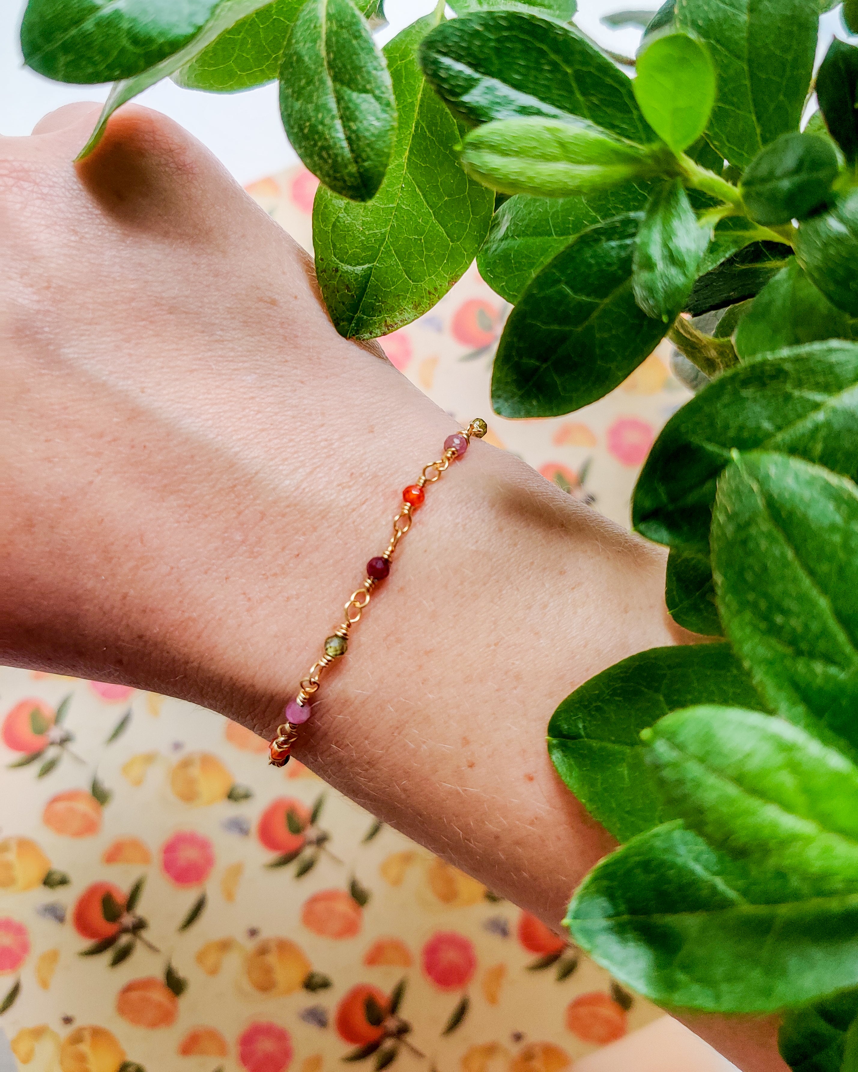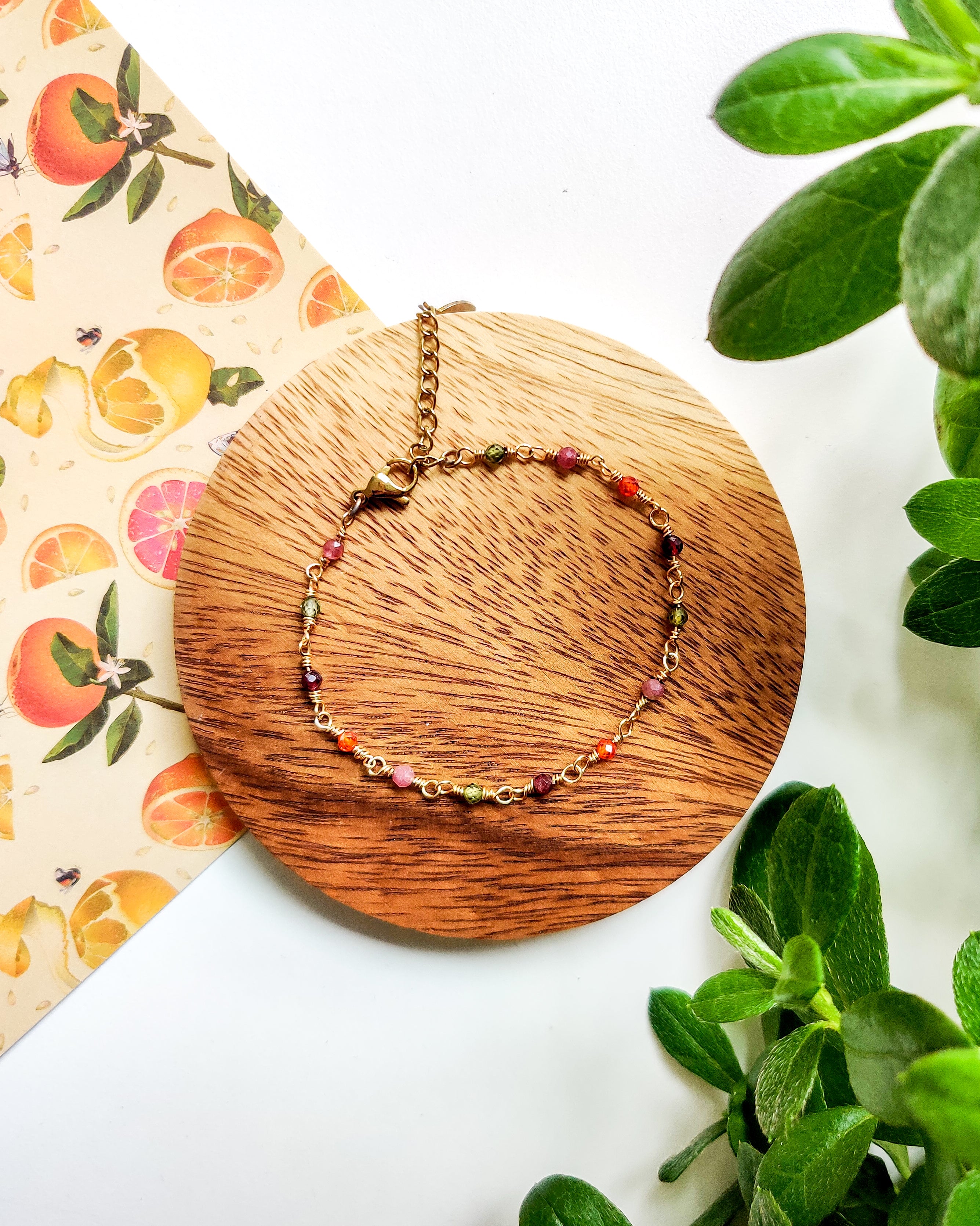 Wire-wrapped bracelet with natural stone Amethyst, Rose Quartz, Olivine and Topaz beads. These beads are facet cut, giving them a subtle shimmer.
