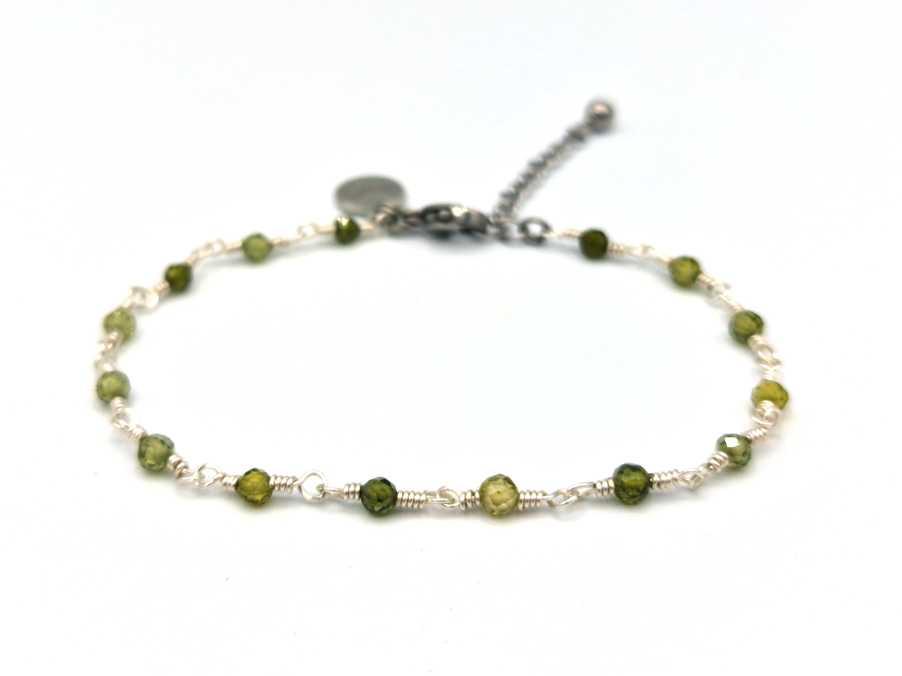 Wire-wrapped bracelet with semi-precious stone Peridot beads. These beads are facet cut, giving them a subtle shimmer. Available in silver and gold.
