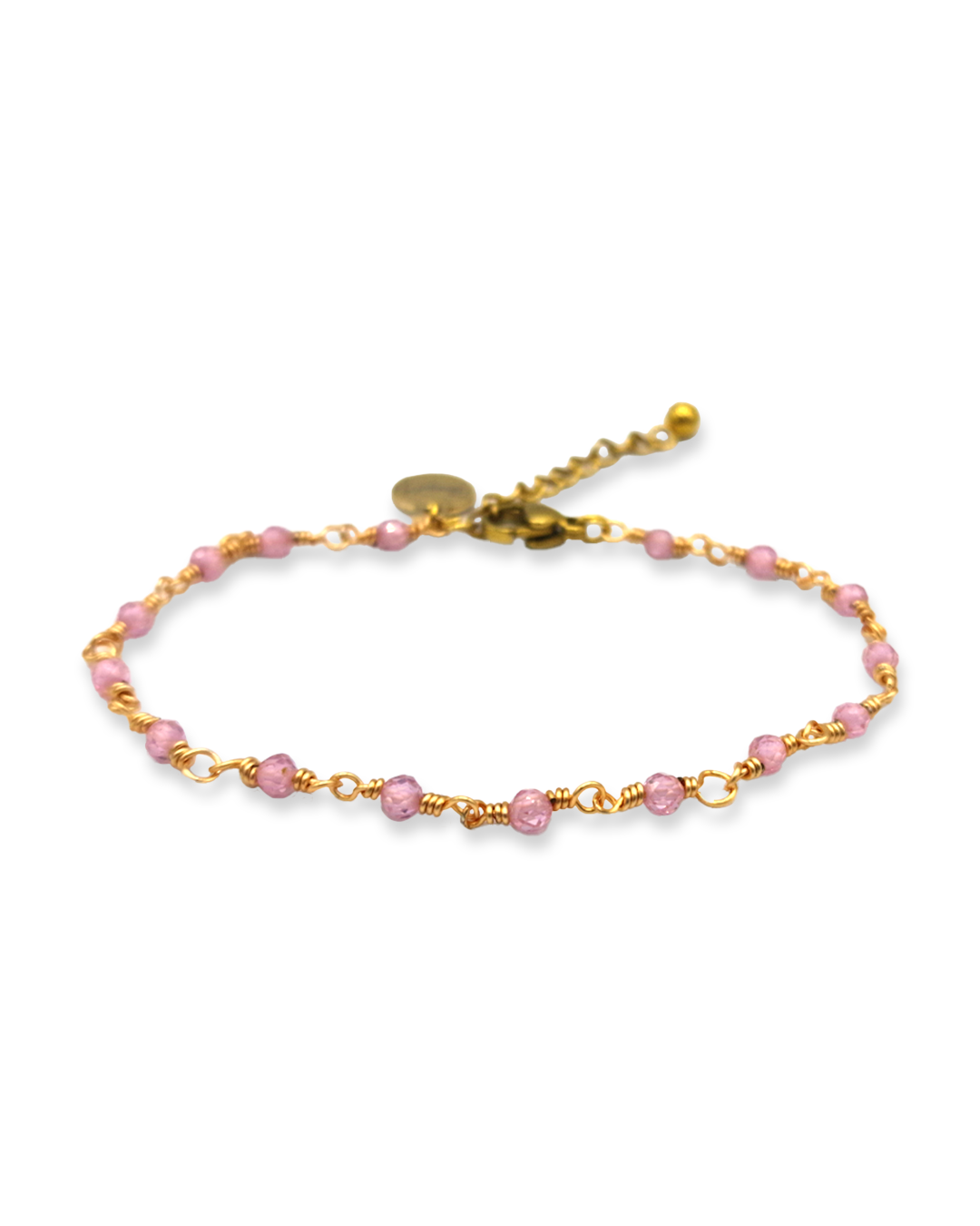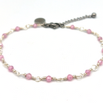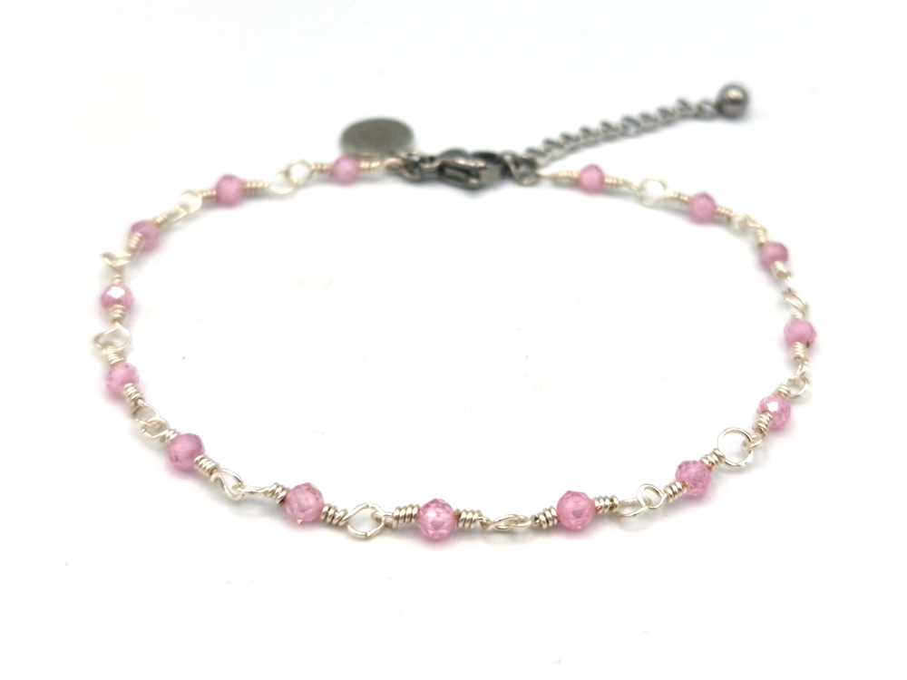 Wire-wrapped bracelet with semi-precious stone Rose quartz beads. These beads are facet cut, giving them a subtle shimmer. Available in silver and gold.