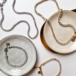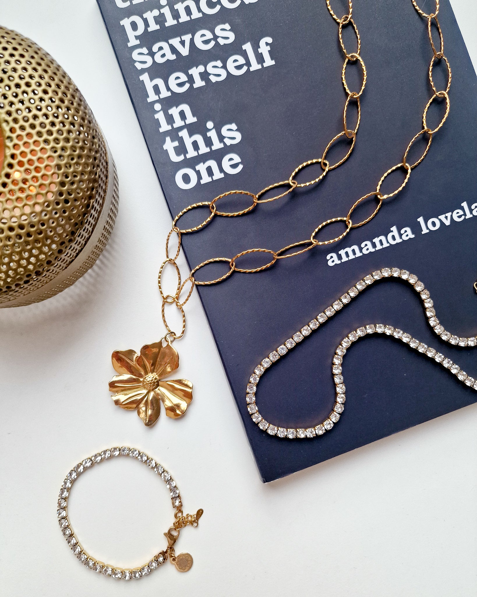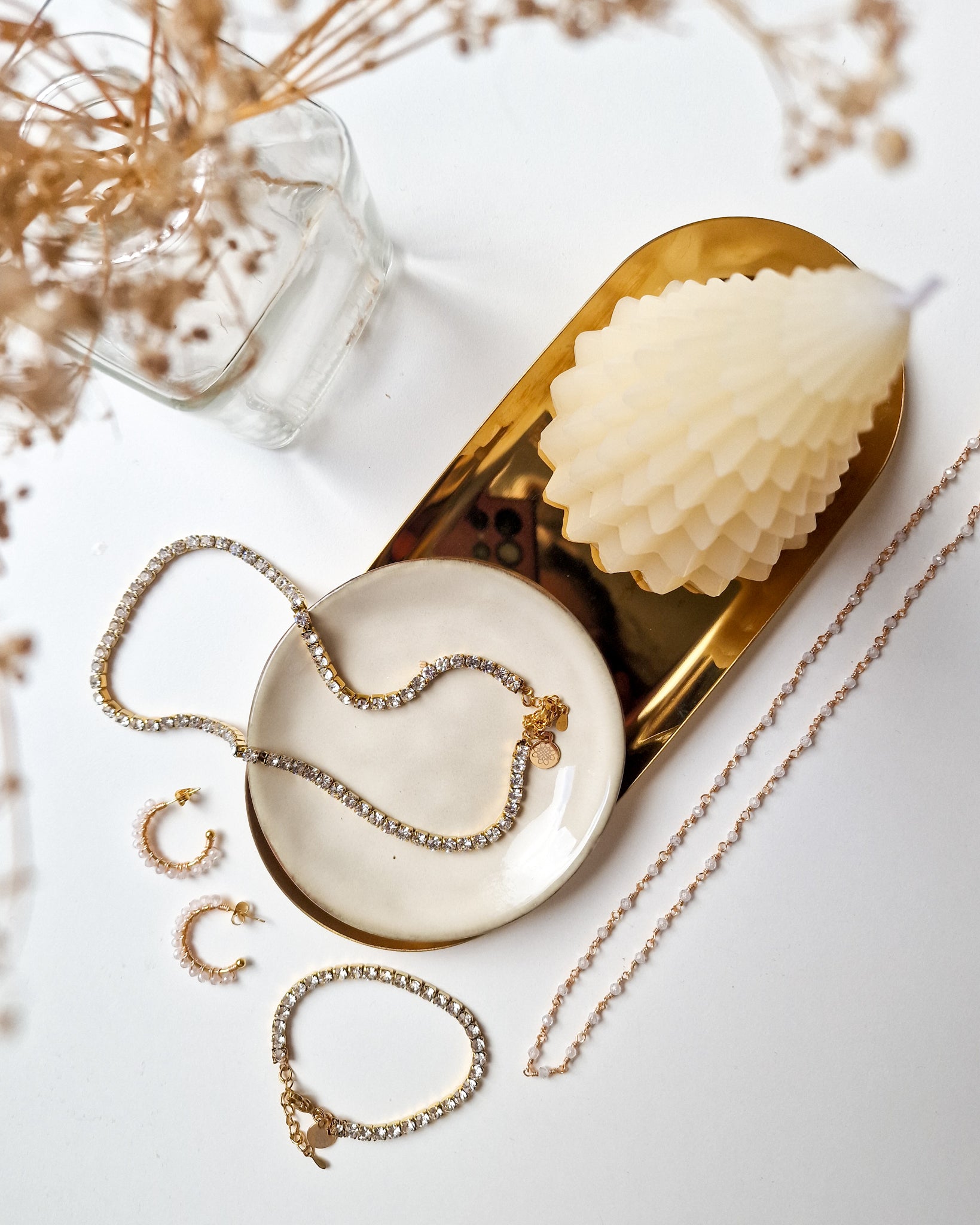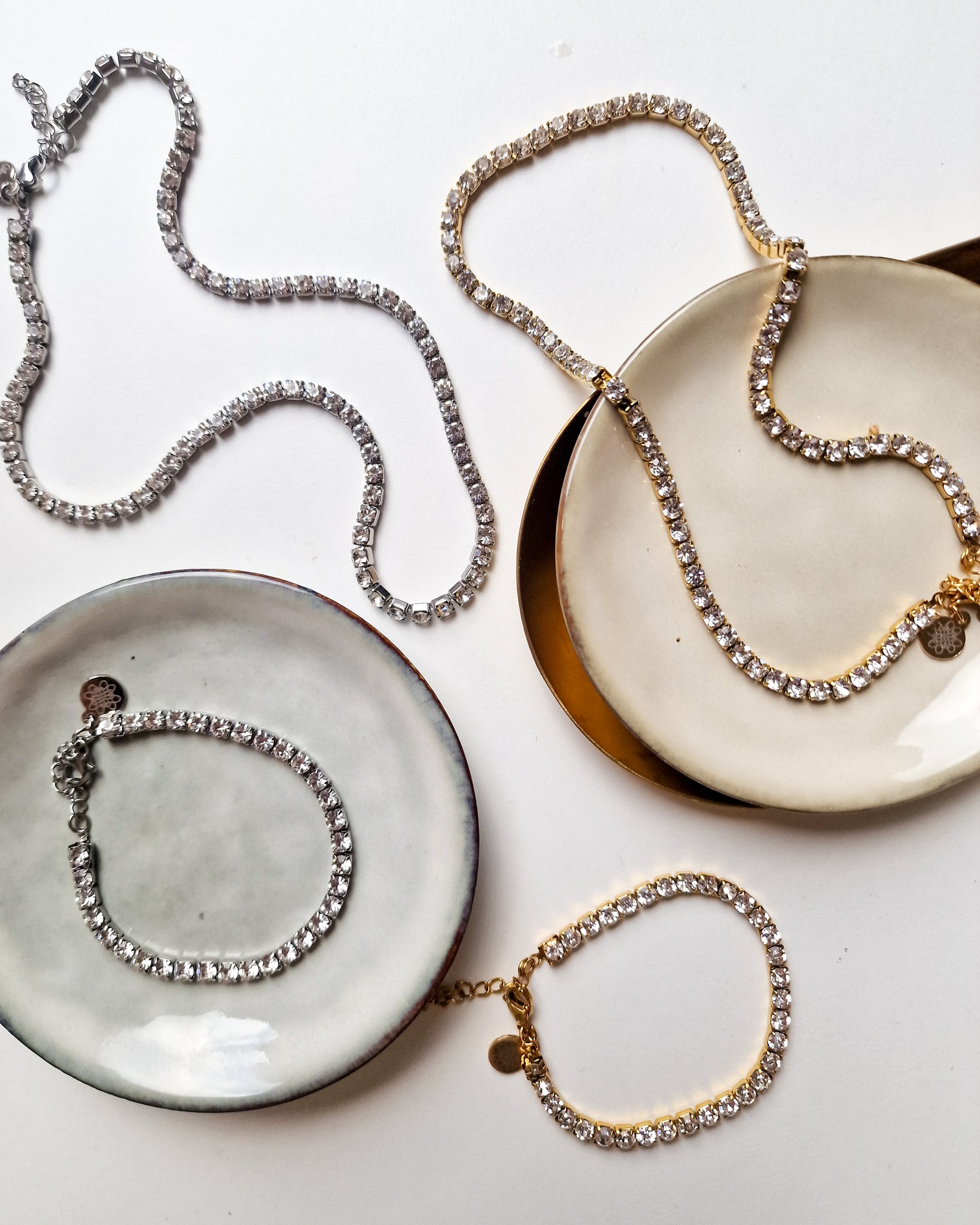 We made it with beautiful transparent glass stones and stainless steel, so that it is not only beautiful, but also long lasting. And you have a choice! Are you going for the classic silver vibe or a golden touch?