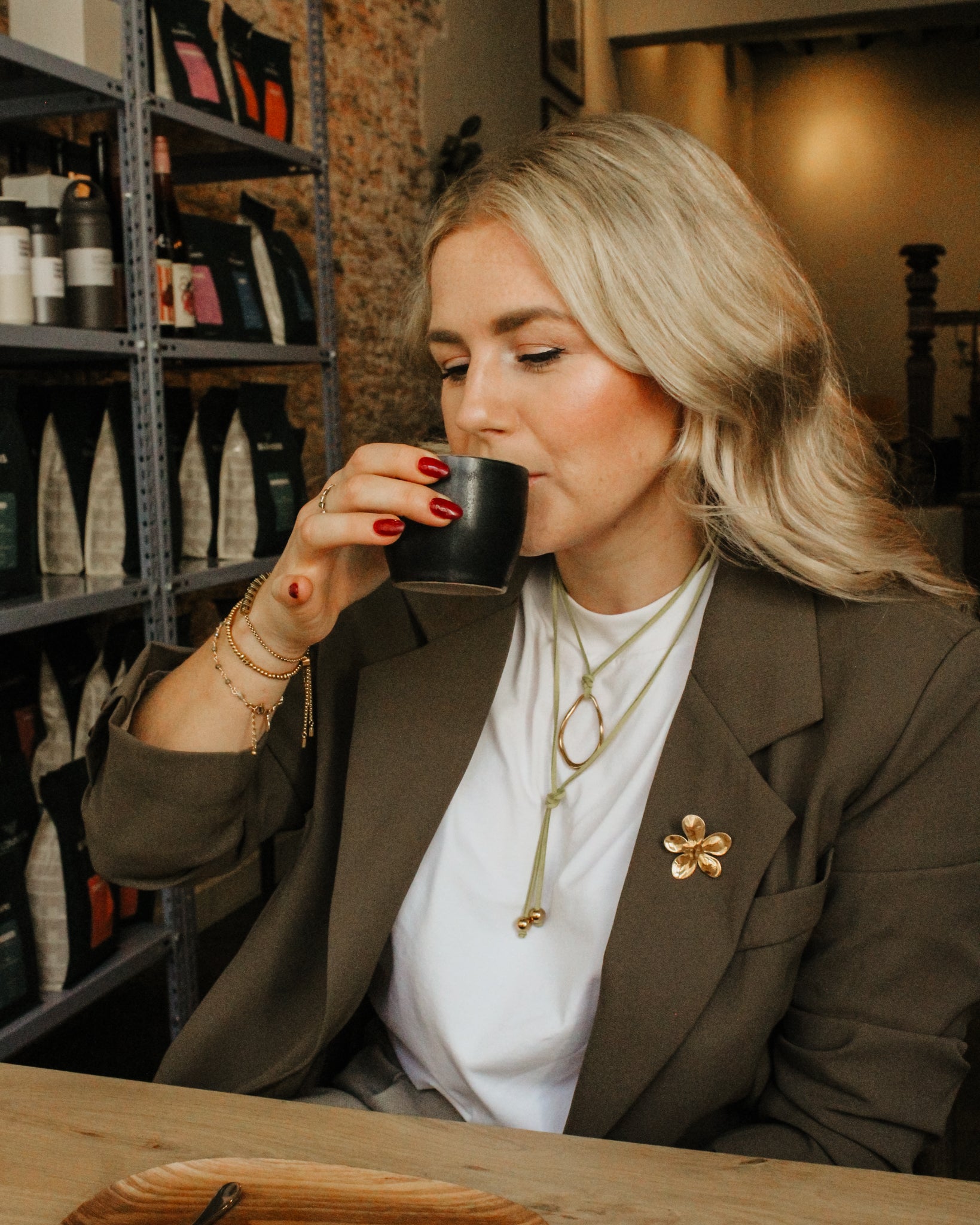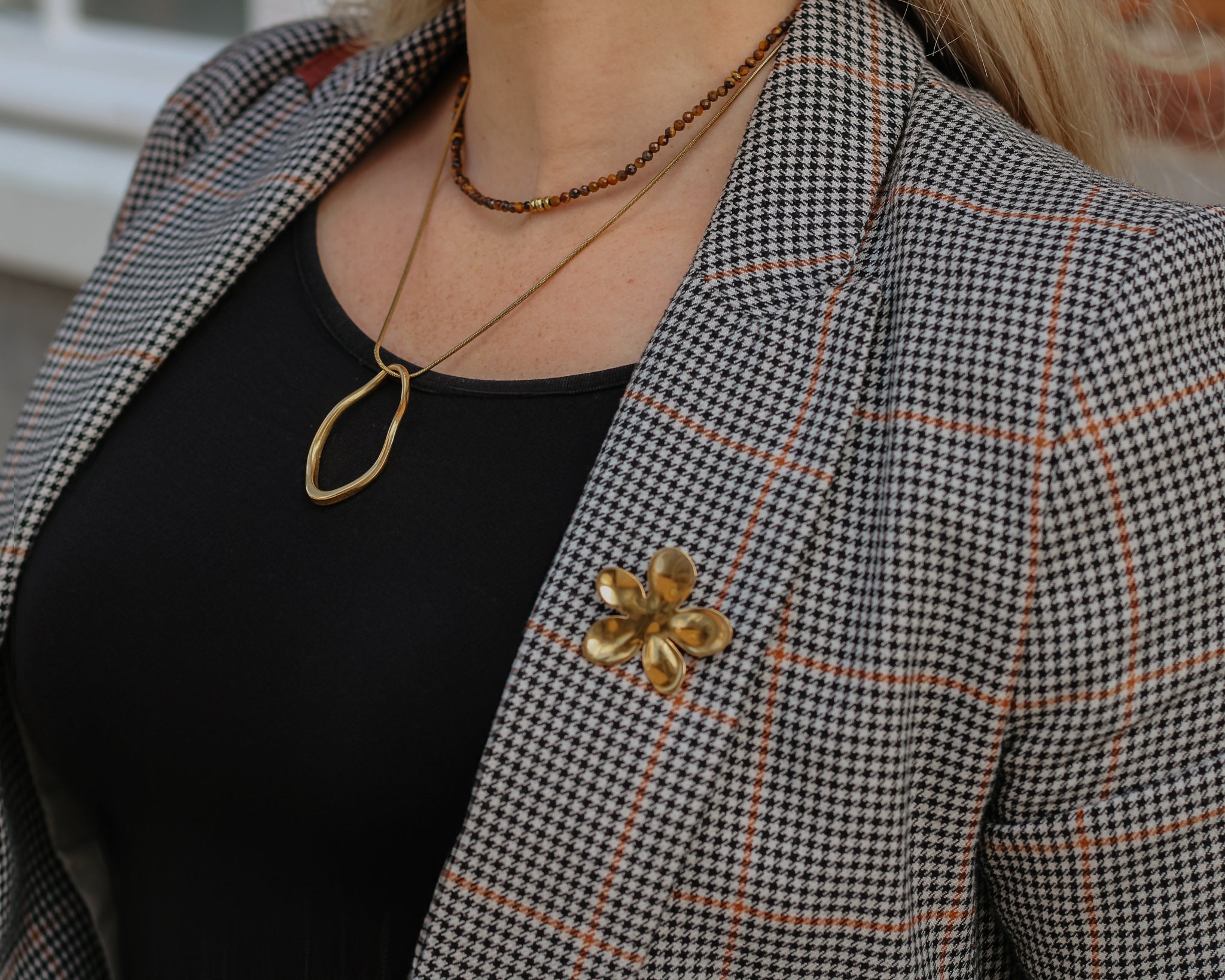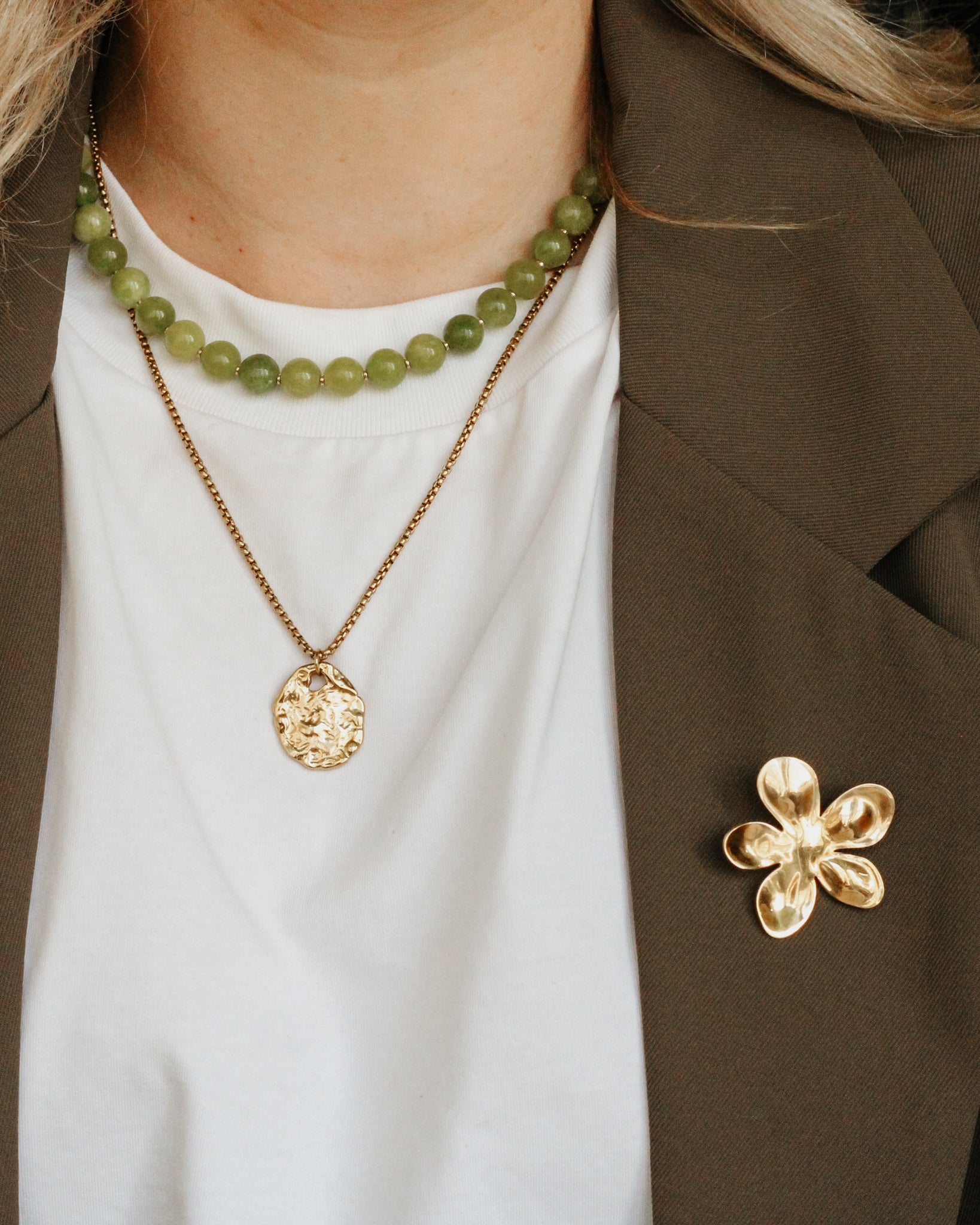Breng de warme kleuren van het seizoen in je look met de Flower broche uit de Fall for Confidence collectie. Ontworpen om je stijl moeiteloos te versterken en je zelfvertrouwen te vergroten, zonder dat je je garderobe hoeft te vernieuwen! Gemaakt met Olivine Green Jade natuursteen kralen.