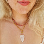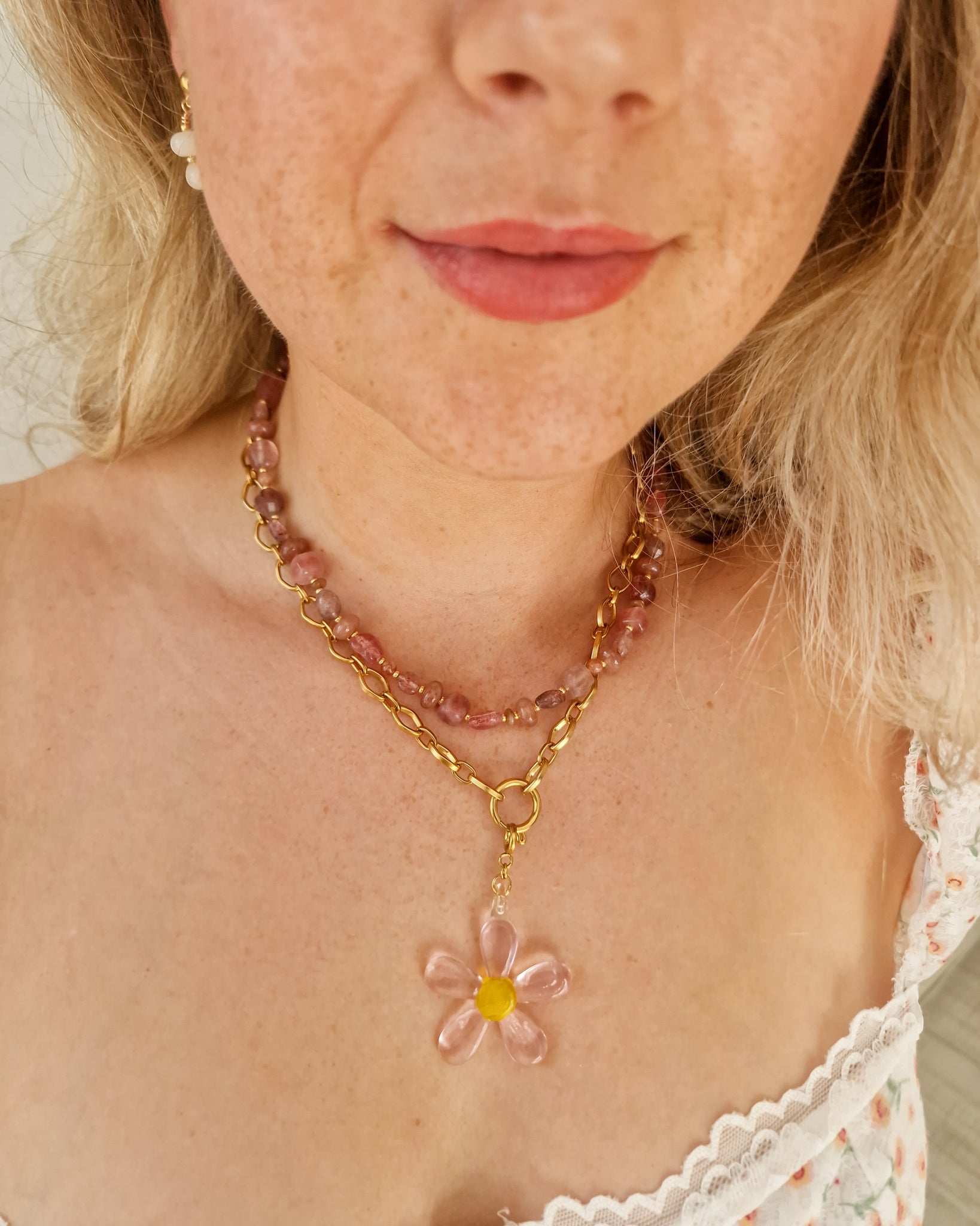 Necklace with natural stone beads and small glass beads in lilac, orange and pink color.