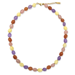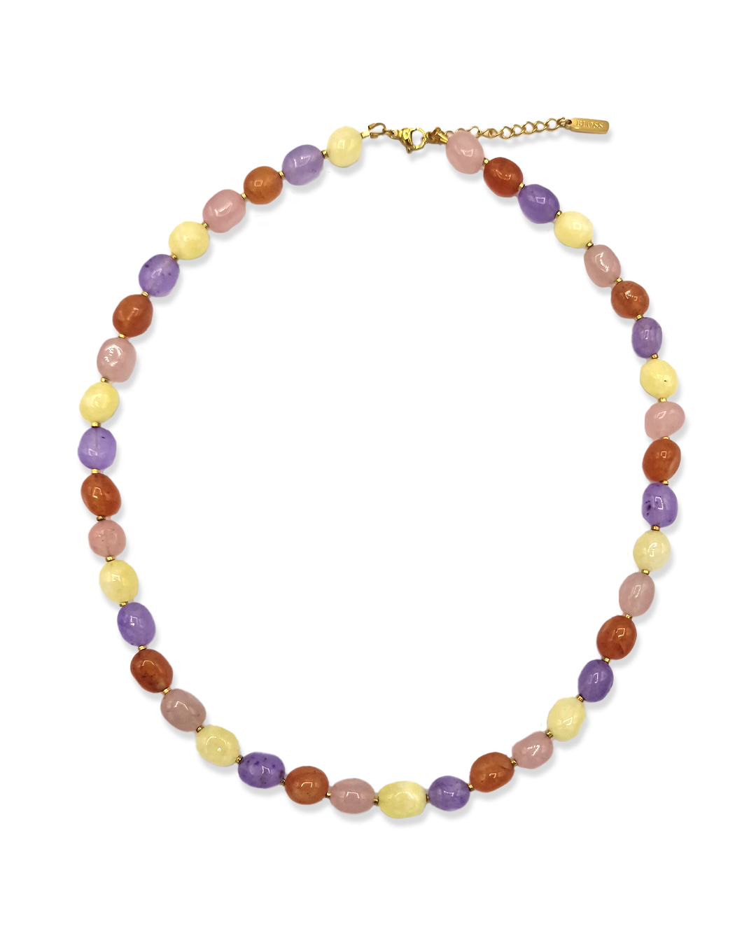 Zin in kleur? De Pastel Mix ketting combineert zachte tinten lila, abrikoos, butter yellow en nude tot een vrolijke eyecatcher die je meteen in de juiste mood brengt. Gemaakt van natuurlijke chalcedoon kralen en afgewerkt met subtiele gouden details. Perfect voor als je outfit een boost kan gebruiken, solo of als kleurrijke layering piece. Playful, bold en helemaal BLOSS.