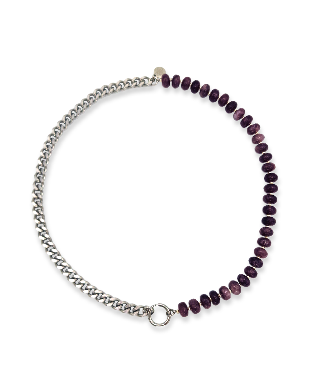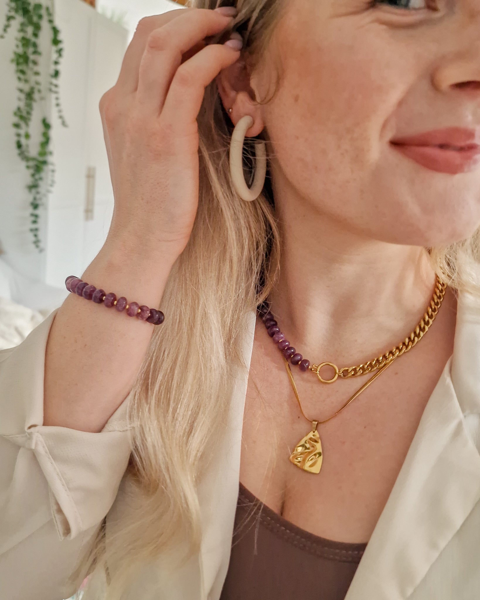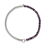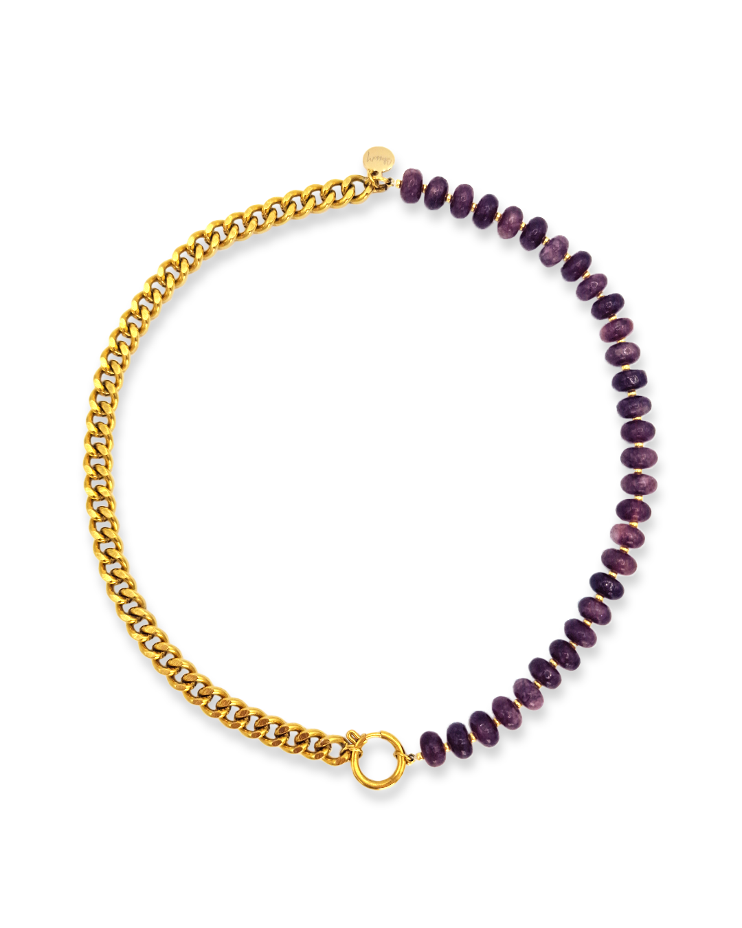 Make a statement with our Plum Berry necklace, a mix of deep purple chalcedony beads and premium stainless steel chain. With a handy 12 mm clasp for your favorite pendants and a length of 44 cm, this necklace is perfect to complete your look! Each piece is carefully handmade in the Netherlands from beautiful natural stone beads, so no two beads are the same. And also available in silver!