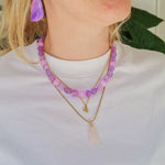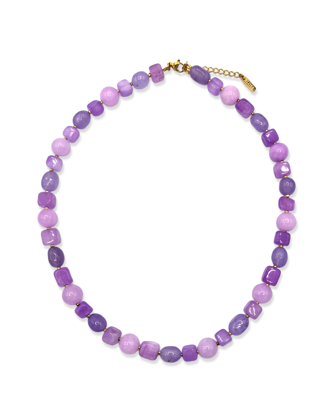 All shades of power. De Purple Mix Stone ketting combineert ronde en vierkante chalcedoon kralen in tinten lavendel, lila en violet, voor een speelse, maar elegante look. De afwisseling in vorm en kleur geeft deze ketting een eigenwijze twist, terwijl de gouden details zorgen voor een chique finish. Draag ‘m solo voor impact of mix ‘m met andere kettingen voor een bold BLOSS-statement.