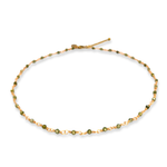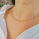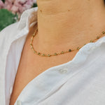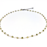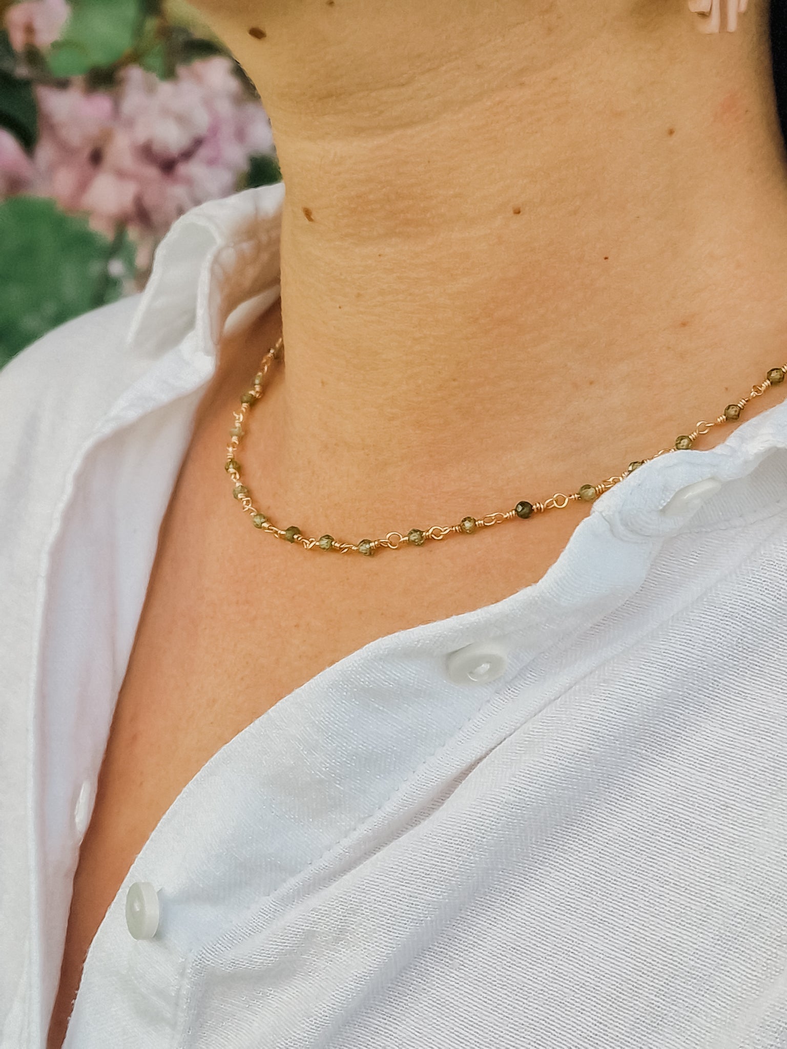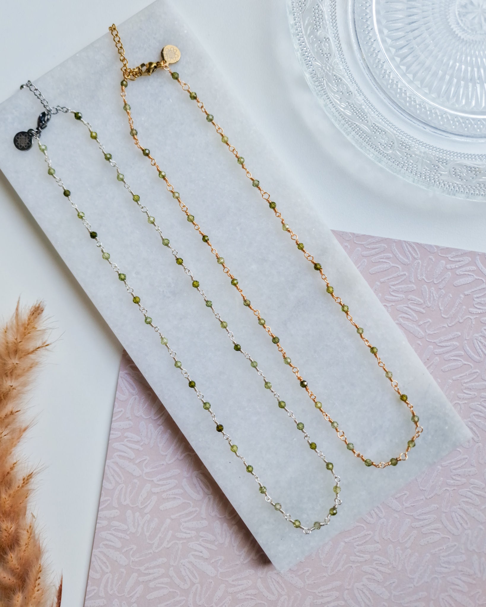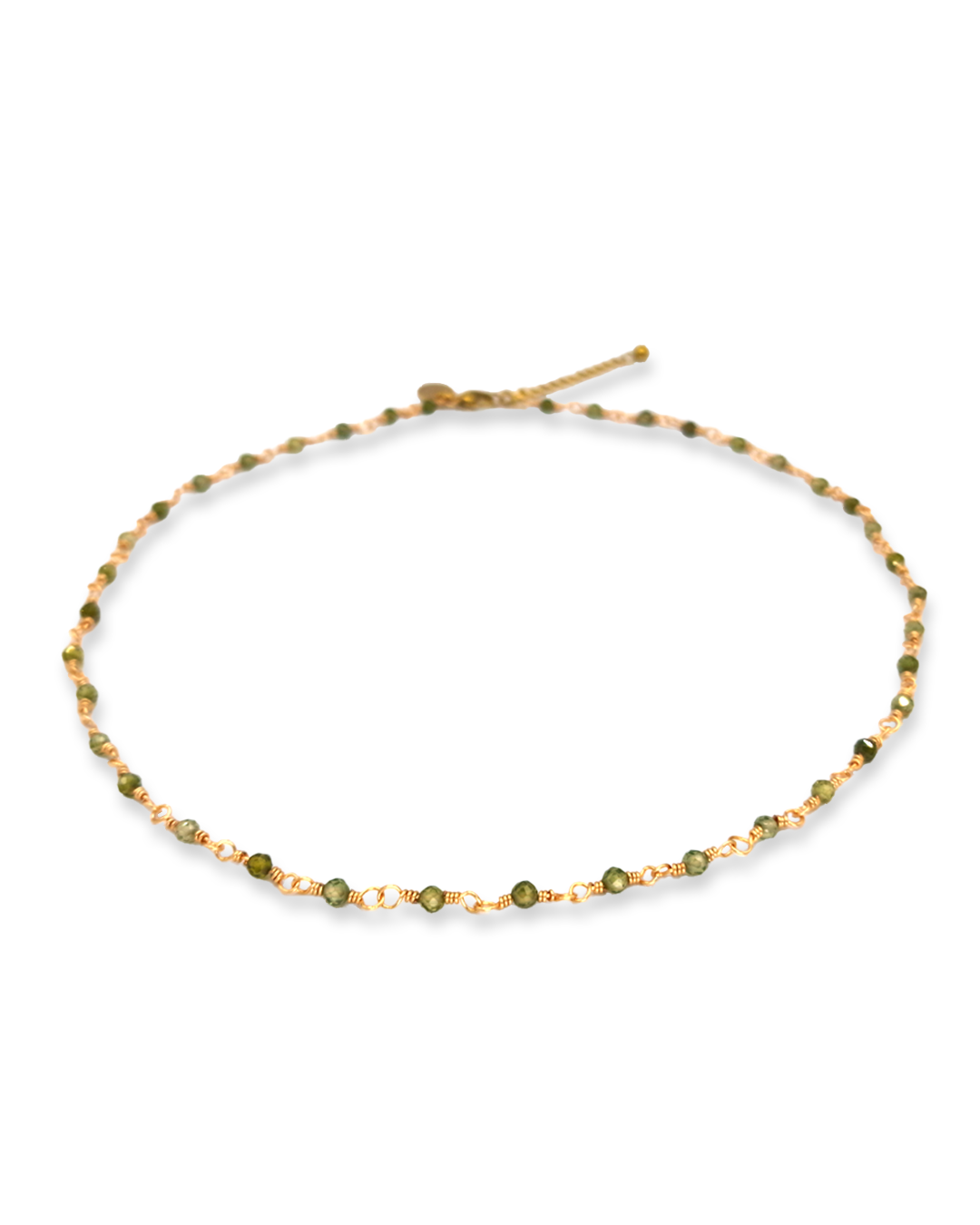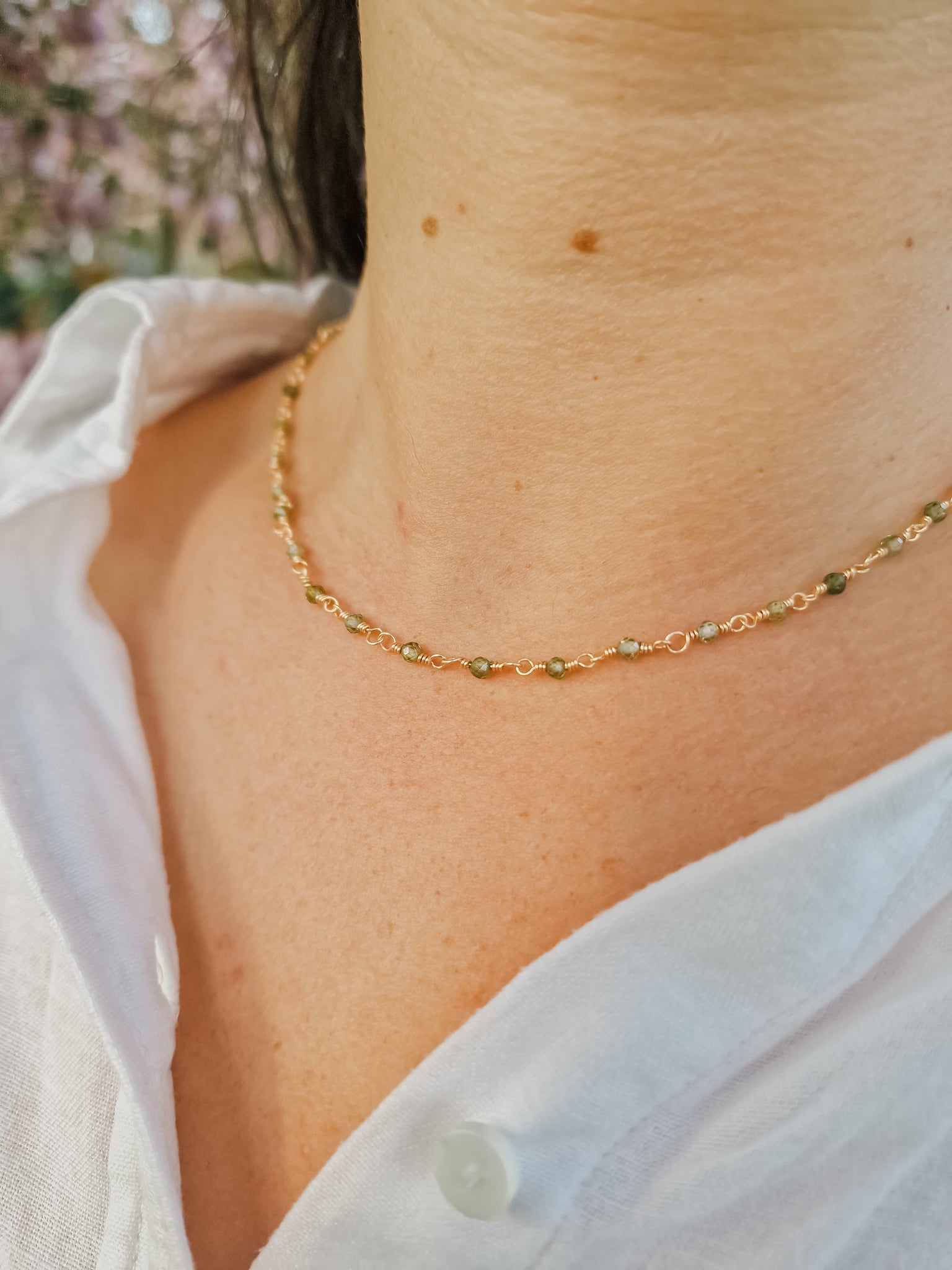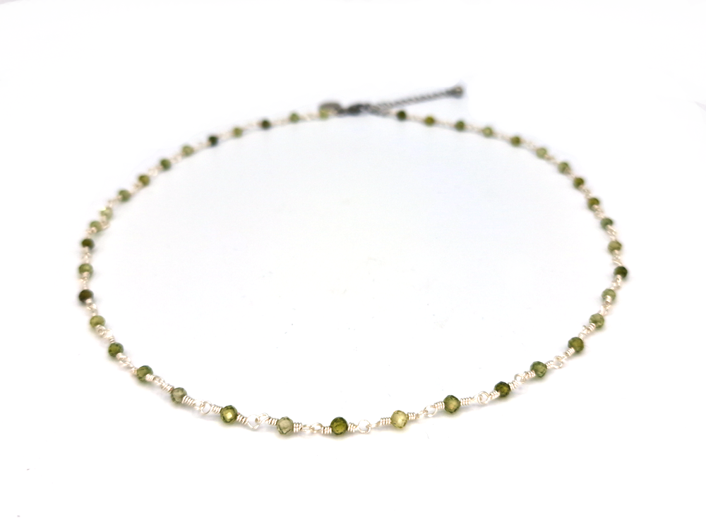 Wire-wrapped necklace with natural stone Peridot green beads. These beads are facet cut, giving them a subtle shimmer.