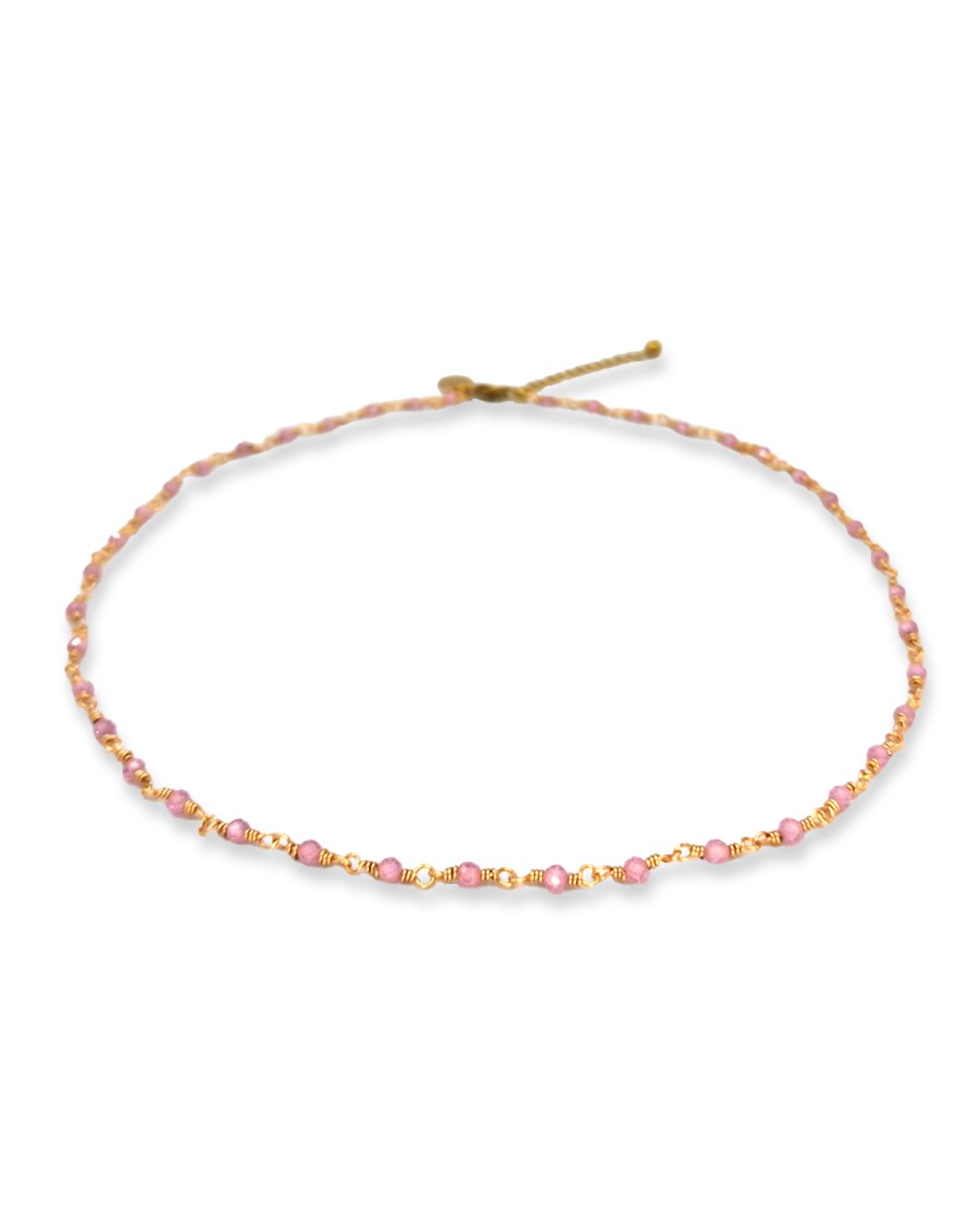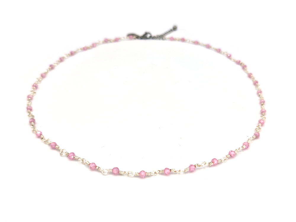 Wire-wrapped necklace with natural stone Rose quartz beads. These beads are facet cut, giving them a subtle shimmer.