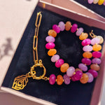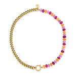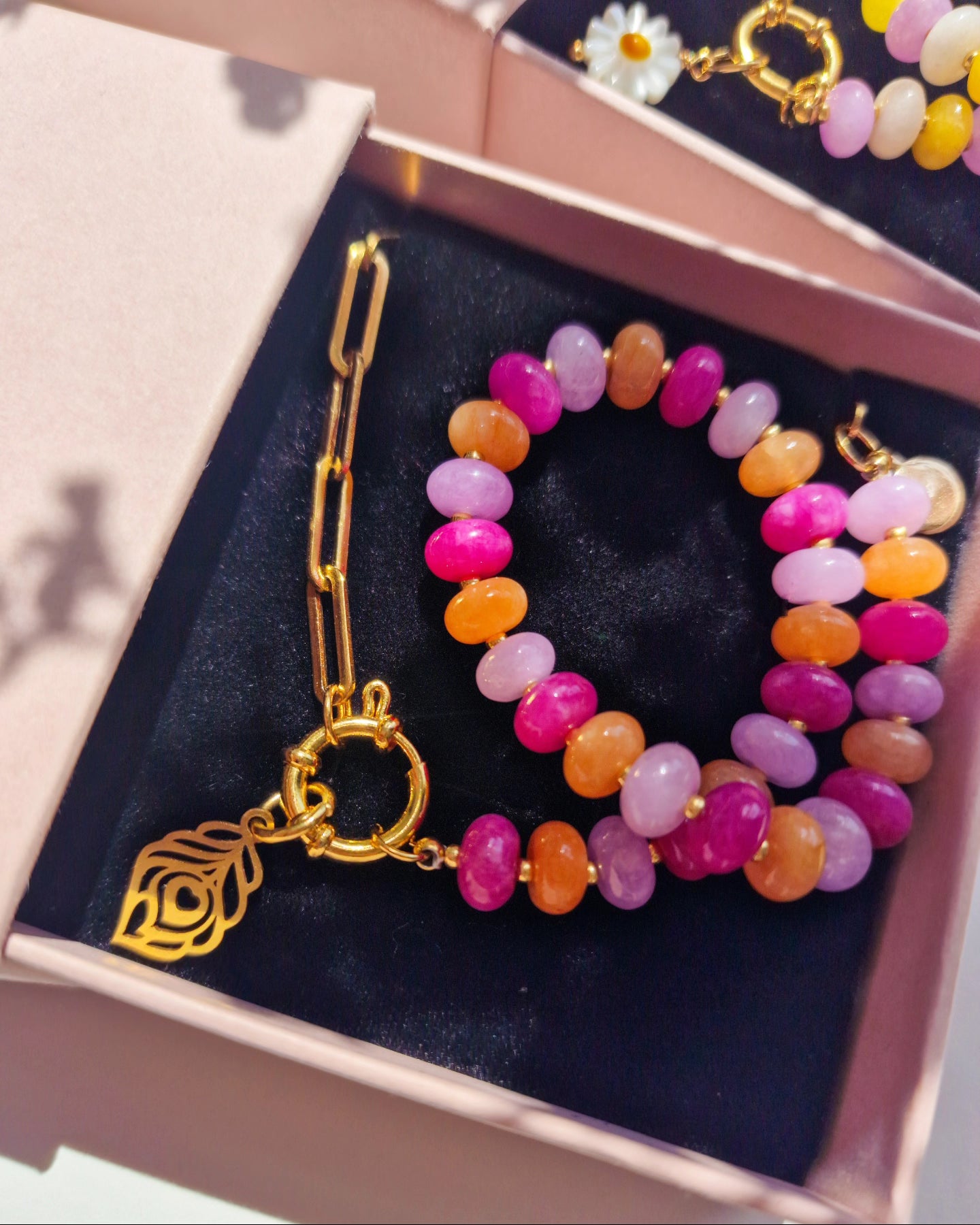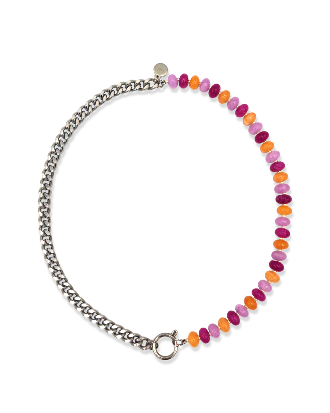 Necklace with natural stone beads and small glass beads in lilac, orange and pink color.