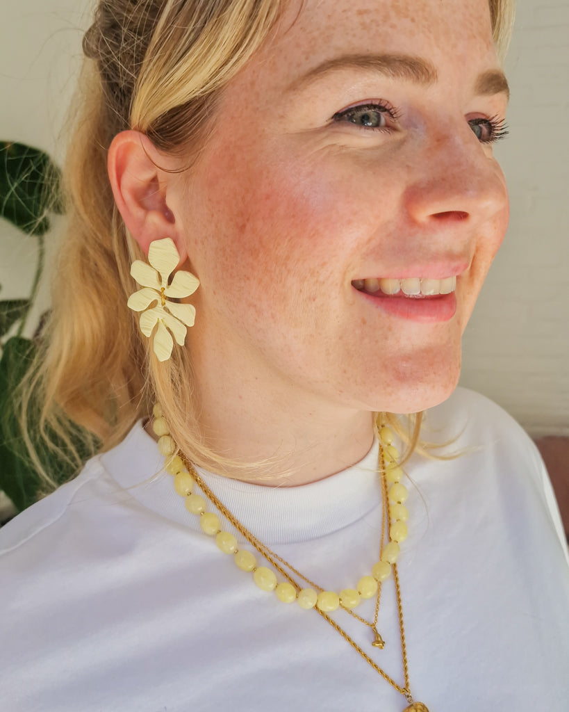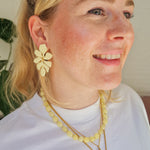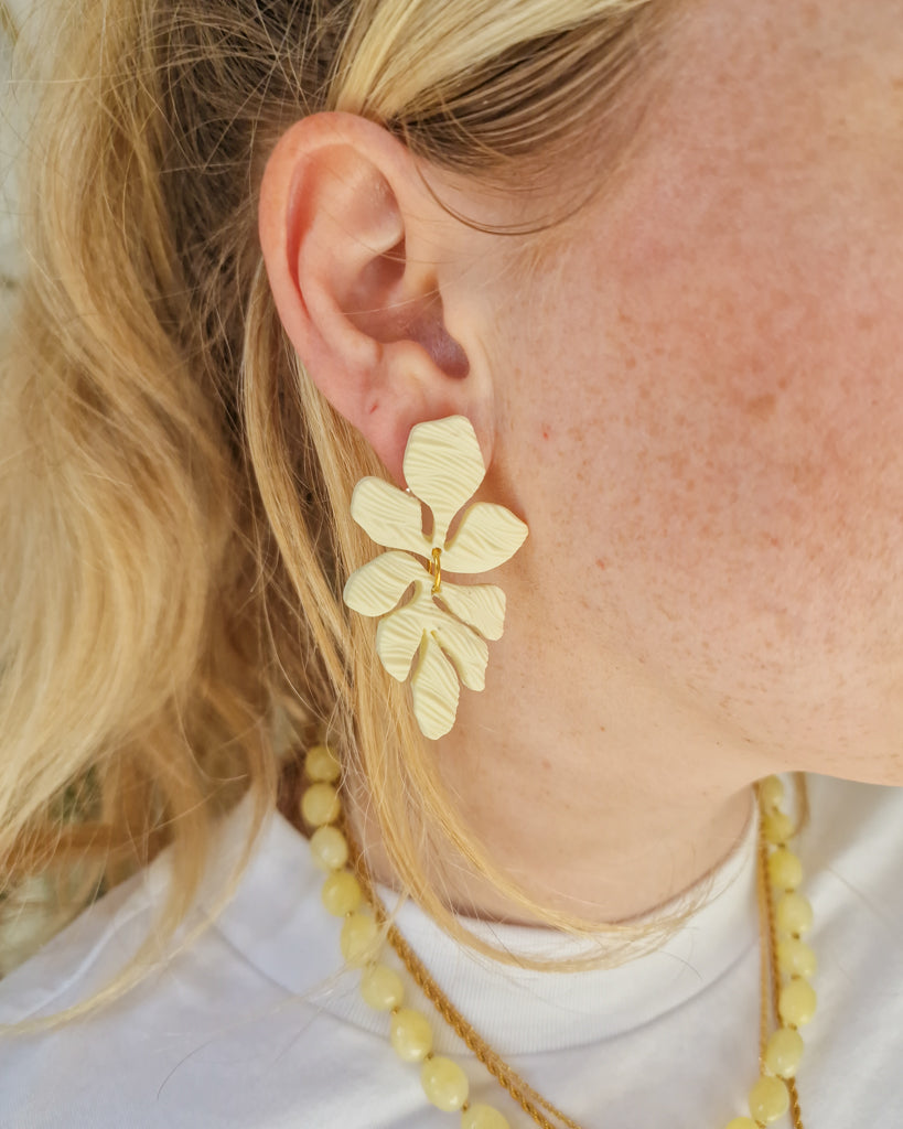 Statement met een zomerse vibe. De Butter Yellow Flower oorbellen zijn gedurfd, speels en licht als een veertje. Met hun organische bloemvorm en botergele kleur stelen ze moeiteloos de show, of je nu een simpele top draagt of all-out gaat. Voor als je zin hebt in kleur, lef en complimenten. 100% bold, 100% BLOSS.