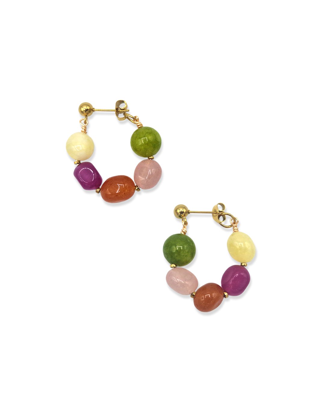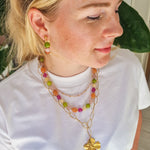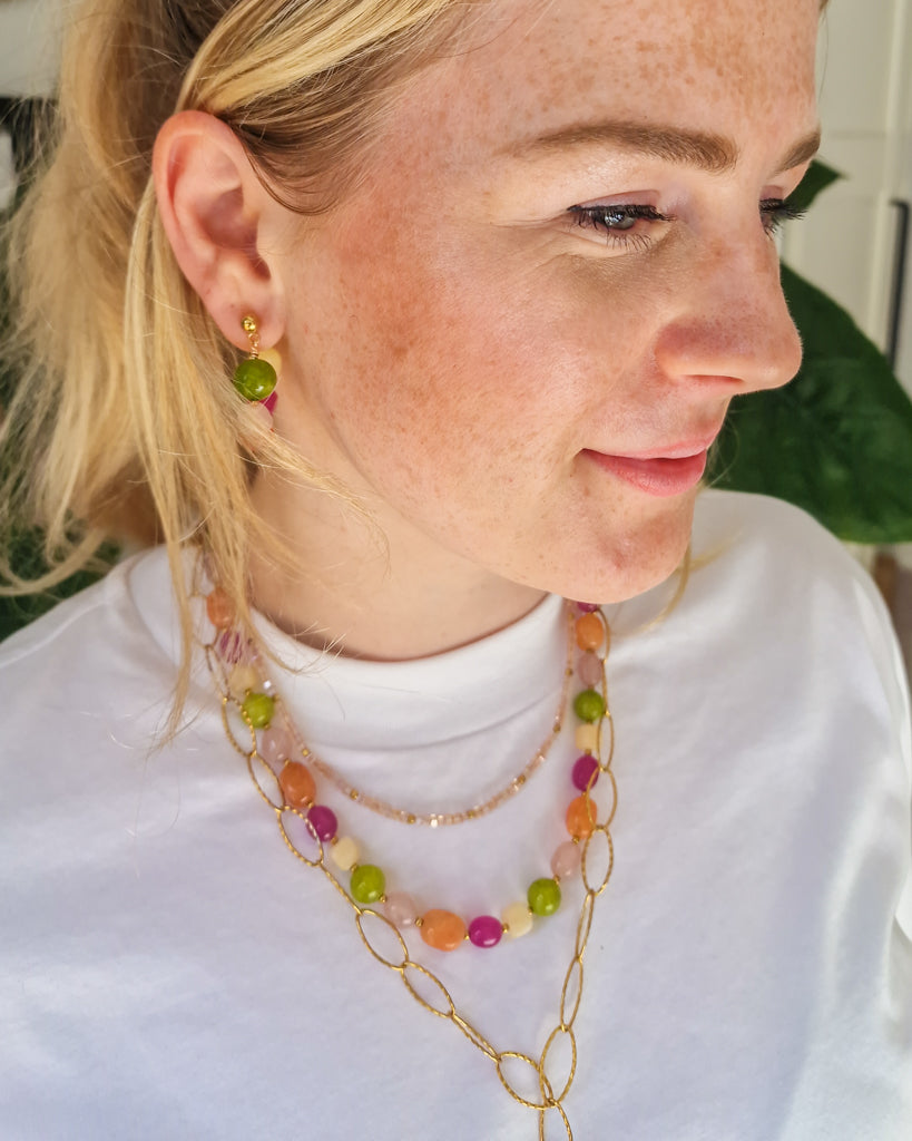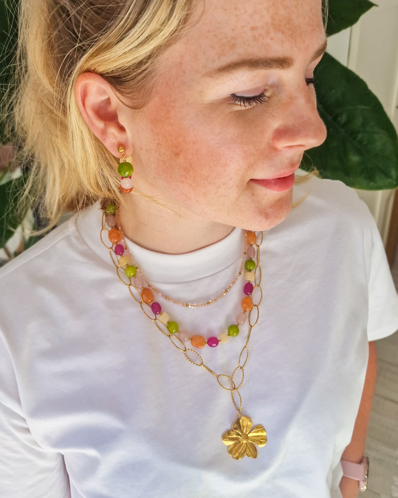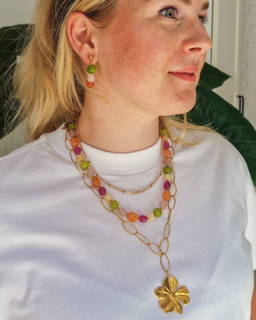 Necklace with natural stone beads and small glass beads in lilac, orange and pink color.