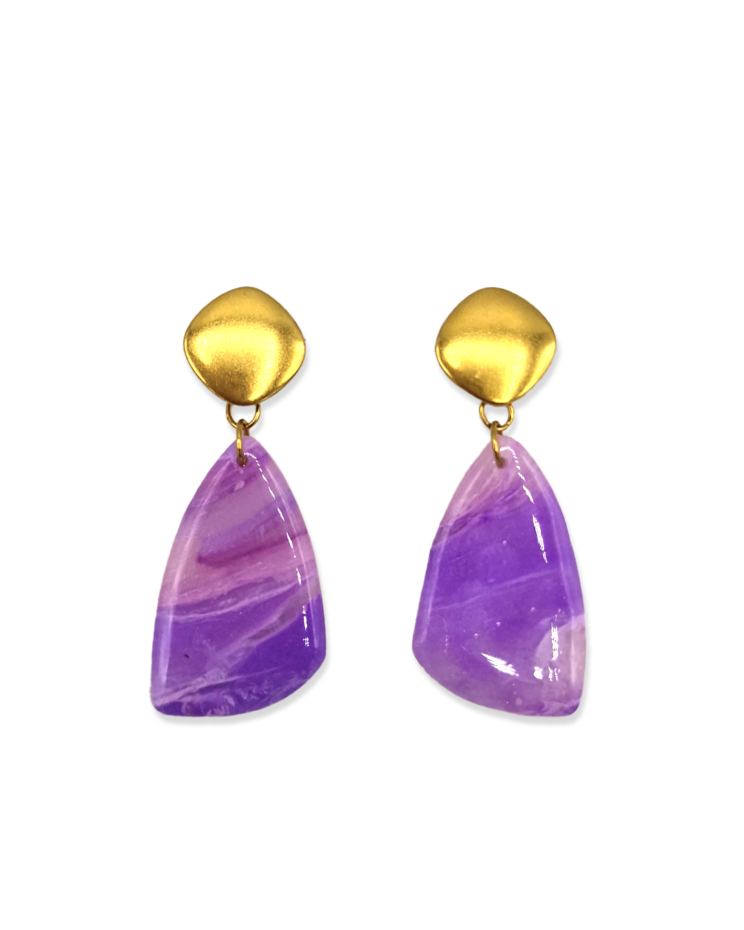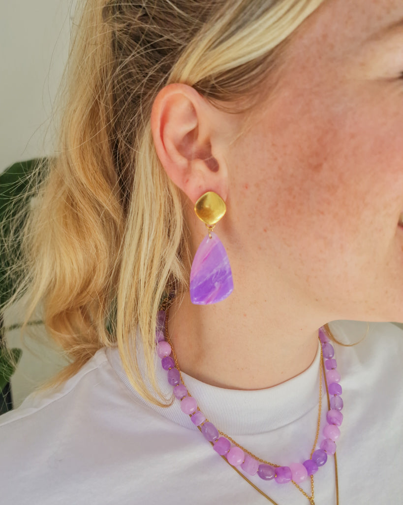 Deze oorbellen zijn anything but basic. De marmerlook lila steen in een speelse druppelvorm matched perfect met de zachte gouden bovenkant. Ze vangen het licht, geven je gezicht nét die lift en tillen je look moeiteloos naar next level. Statement, maar wel draagbaar.
