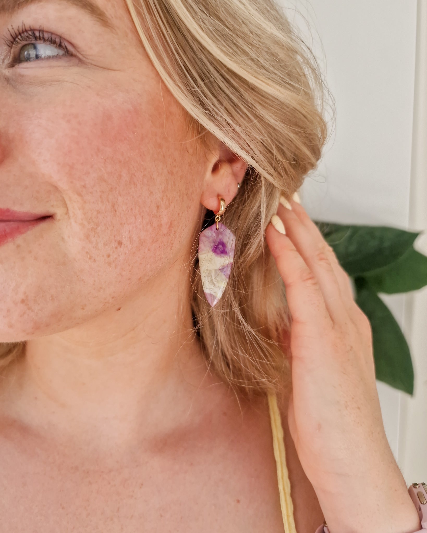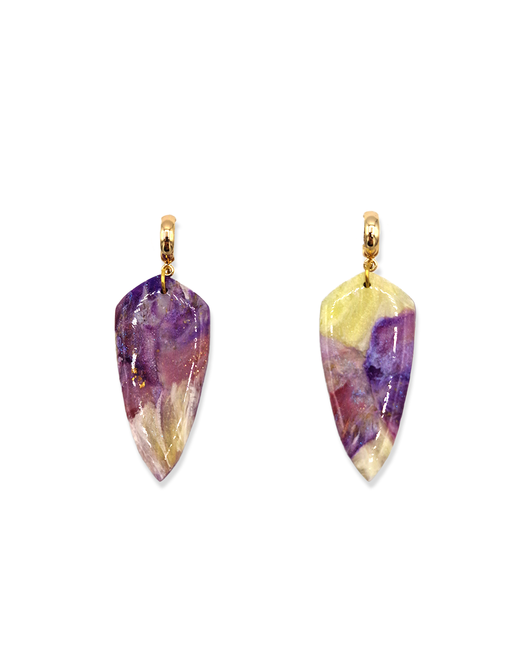 Lichtgewicht klei oorbellen met paarse en gele watercolor effect.