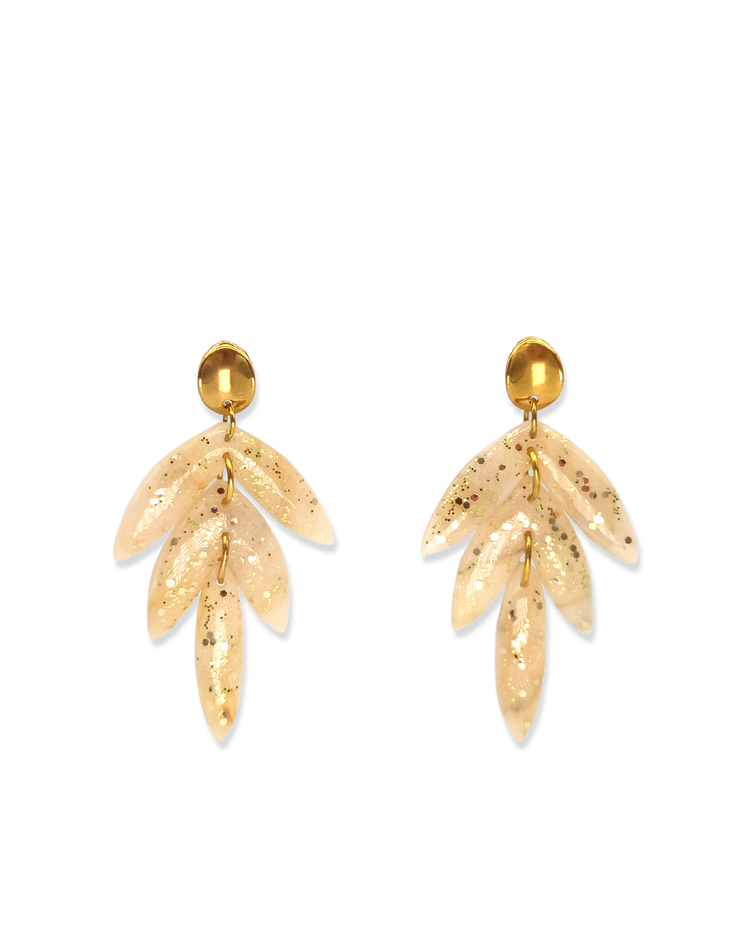 Deze oorbellen bewegen subtiel met je mee en geven je look direct een zelfverzekerde, feestelijke uitstraling. De zachte peach tint met gouden glitter voelt warm en chic. De layered leaf vorm zorgt voor beweging en maakt elk detail sterker zonder dat het zwaar wordt. De glanzende ronde top houdt het modern en clean.