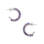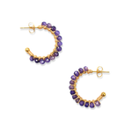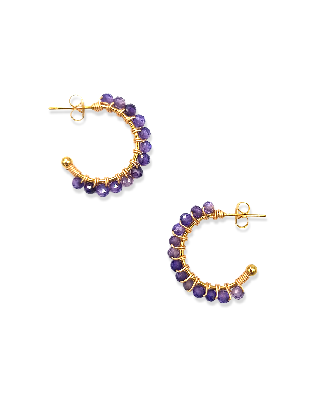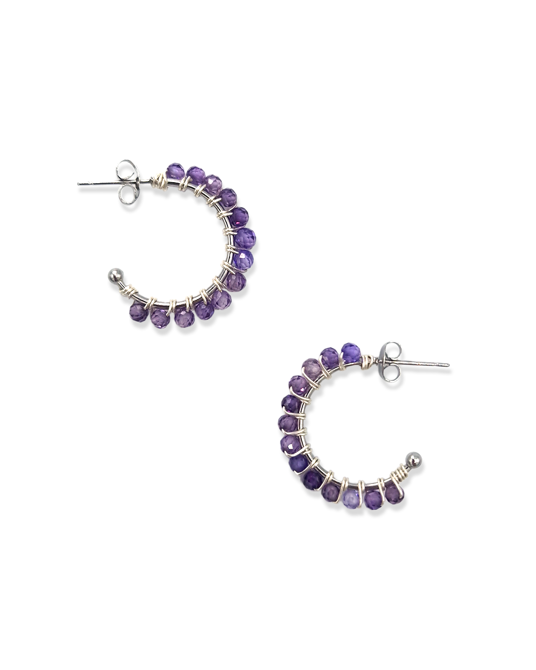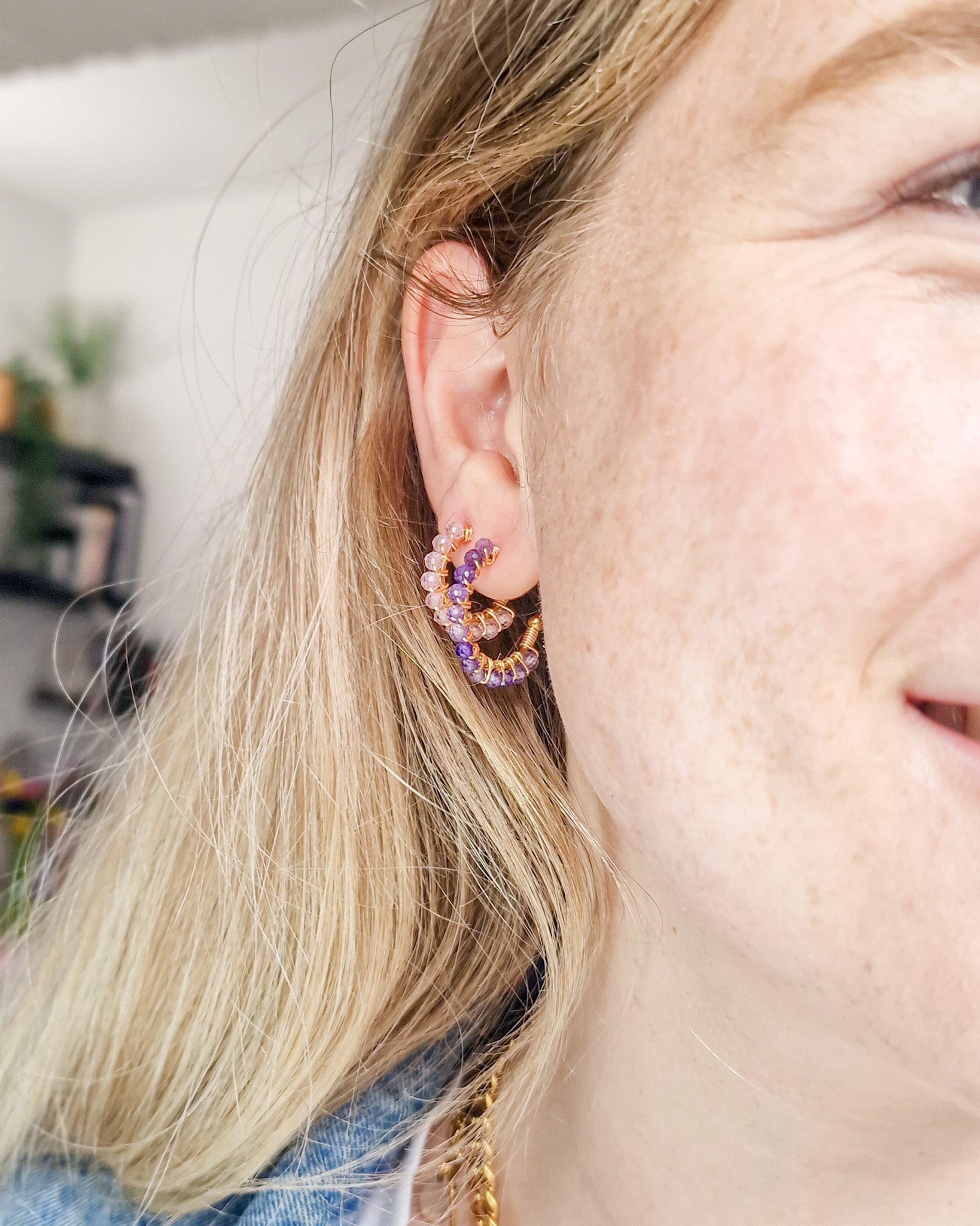 Wire-wrapped oorringetjes met half-edelsteen Amethyst kraaltjes. Deze kraaltjes zijn facet geslepen waardoor ze een subtiele shimmer hebben. Verkrijgbaar in zilver en goud.