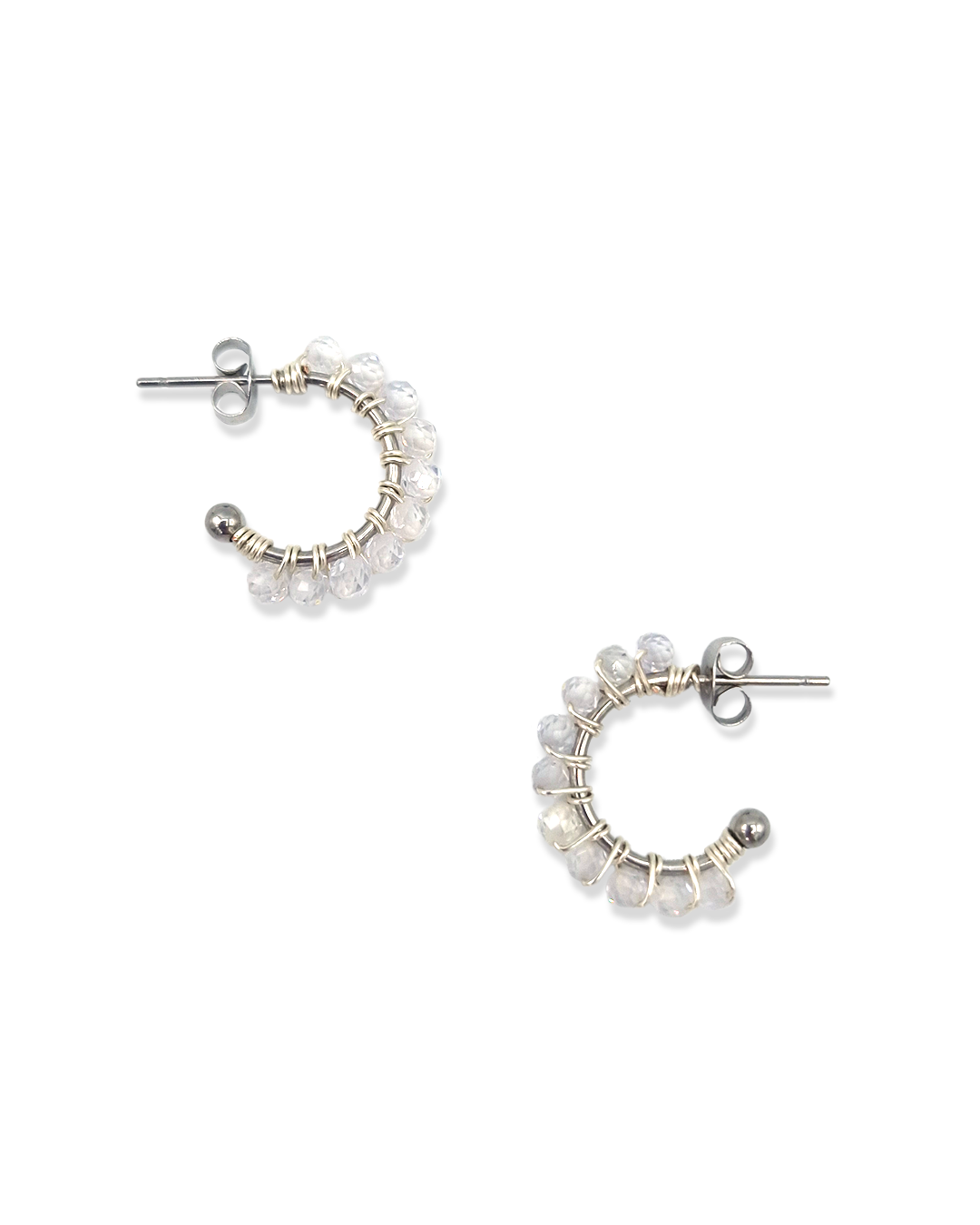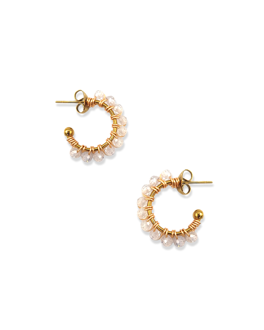 Wire-wrapped oorringetjes met half-edelsteen Chrystal kraaltjes. Deze kraaltjes zijn facet geslepen waardoor ze een subtiele shimmer hebben. Verkrijgbaar in zilver en goud.