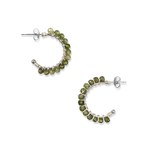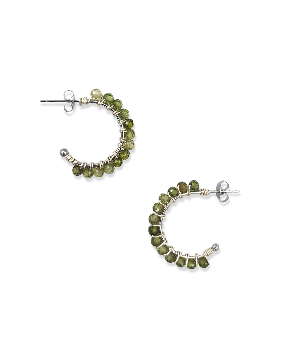 Wire-wrapped oorringetjes met half-edelsteen Peridot kraaltjes. Deze kraaltjes zijn facet geslepen waardoor ze een subtiele shimmer hebben. Verkrijgbaar in zilver en goud.