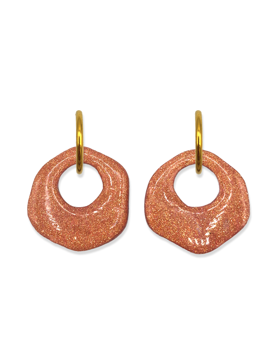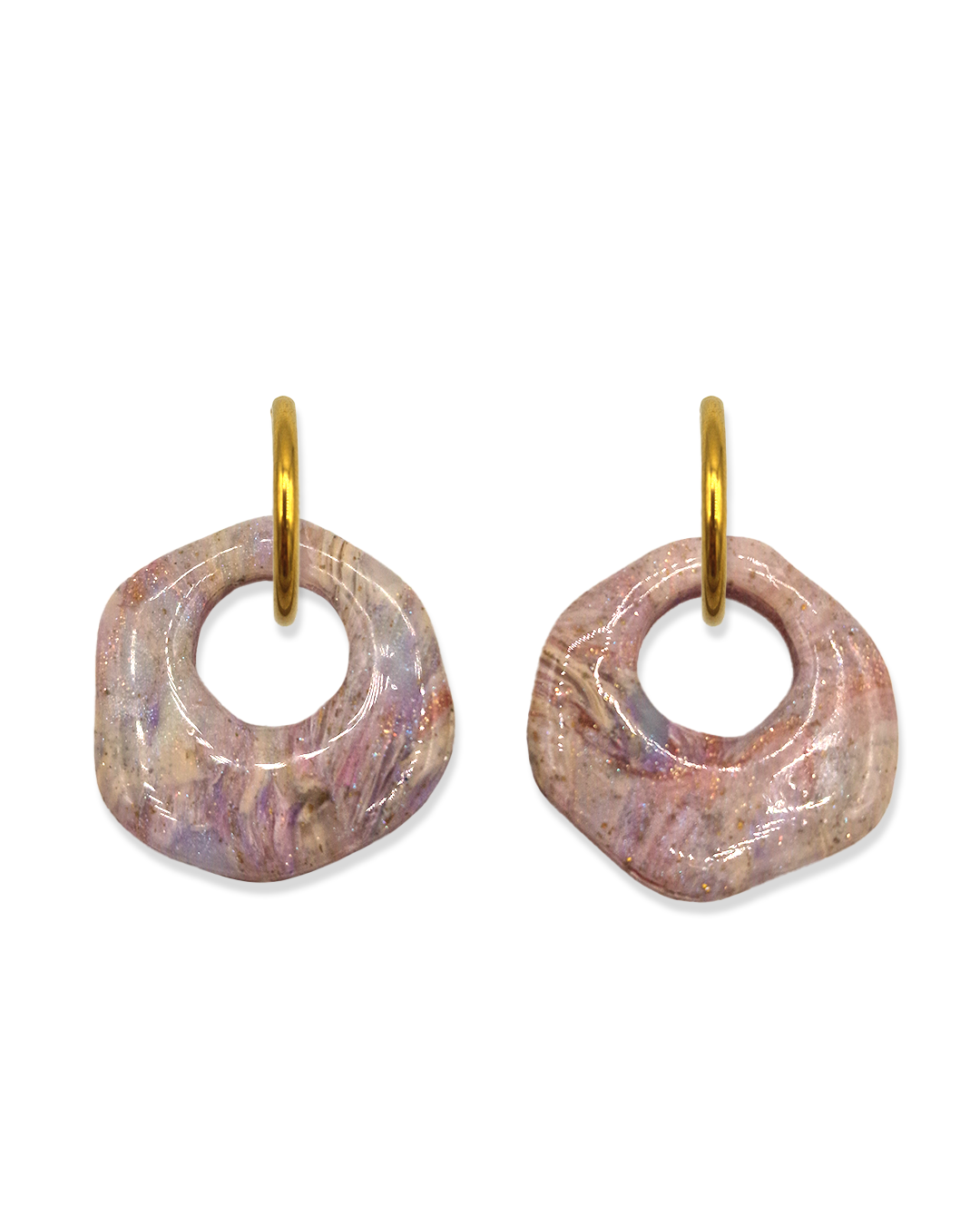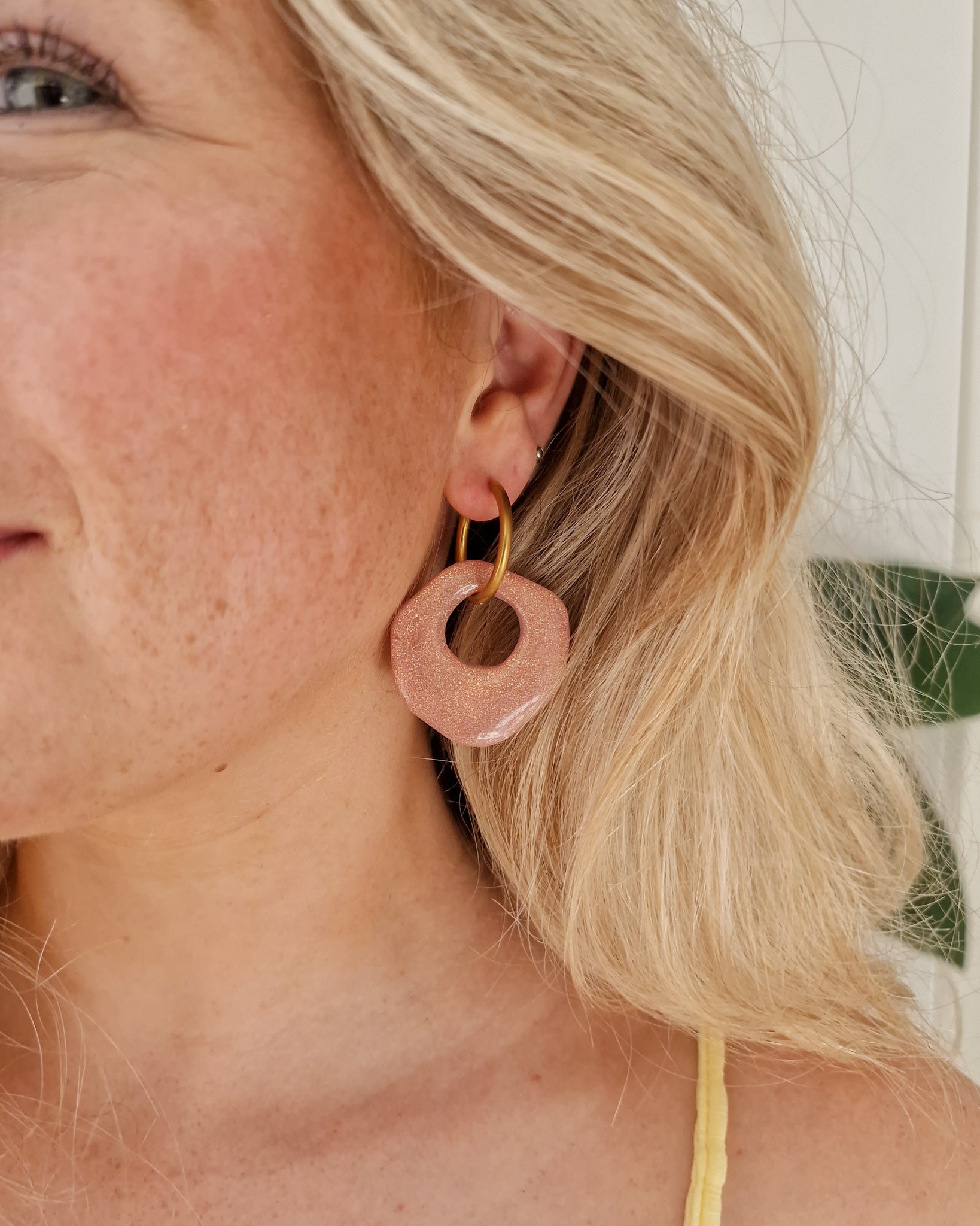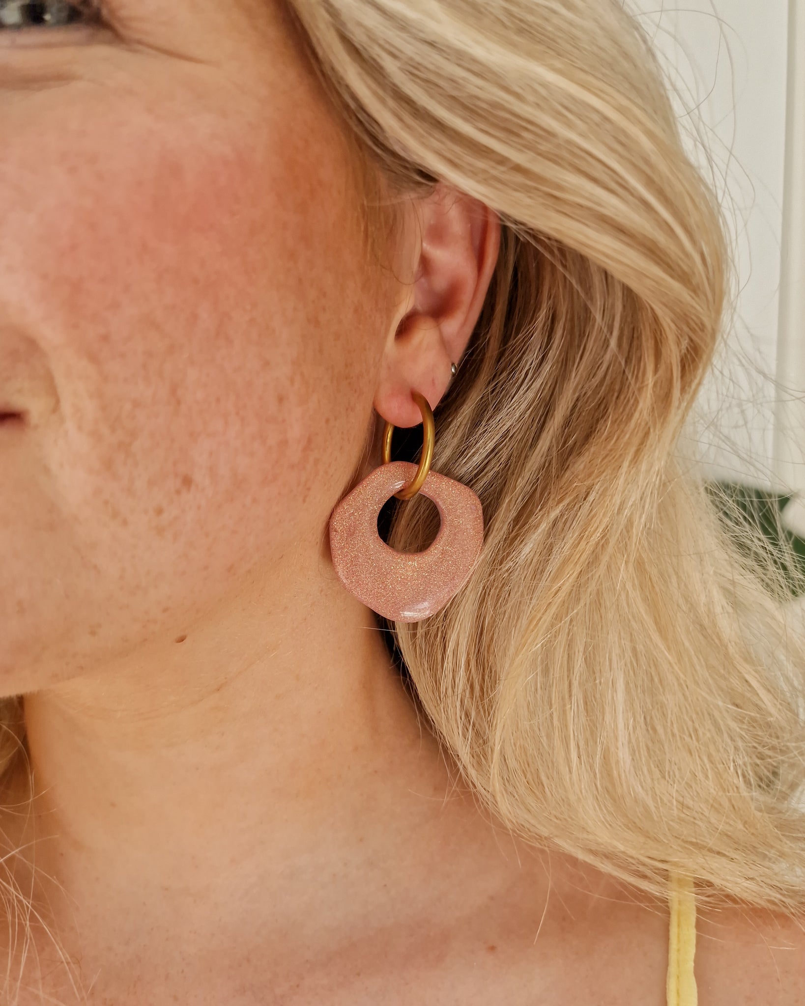 Lichtgewicht klei oorbellen met beachy vibes! Deze oorbellen zijn dubbelzijdig, met aan de achterkant supermooie roze glitters. Je kan ze dus op twee manieren dragen!