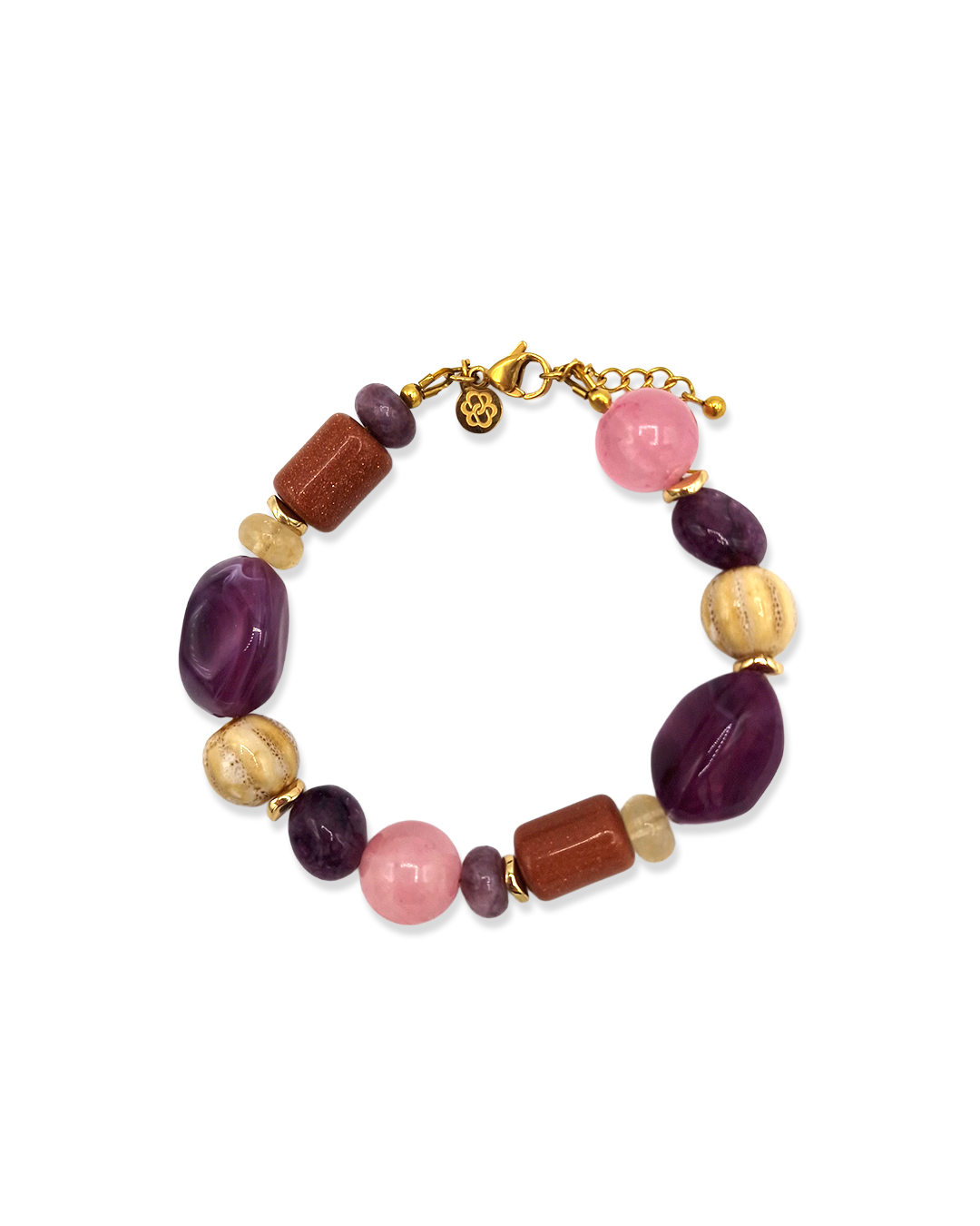 De Armband Rose Clay combineert zachte en diepe kleuren tot een krachtig geheel. De mix van paars, roze, zand en bruin zorgt voor een warme uitstraling die perfect past bij het herfstseizoen. De armband is gemaakt van acryl, glas, natuursteen en stainless steel. Licht van gewicht en ideaal om kleur toe te voegen aan je dagelijkse look.