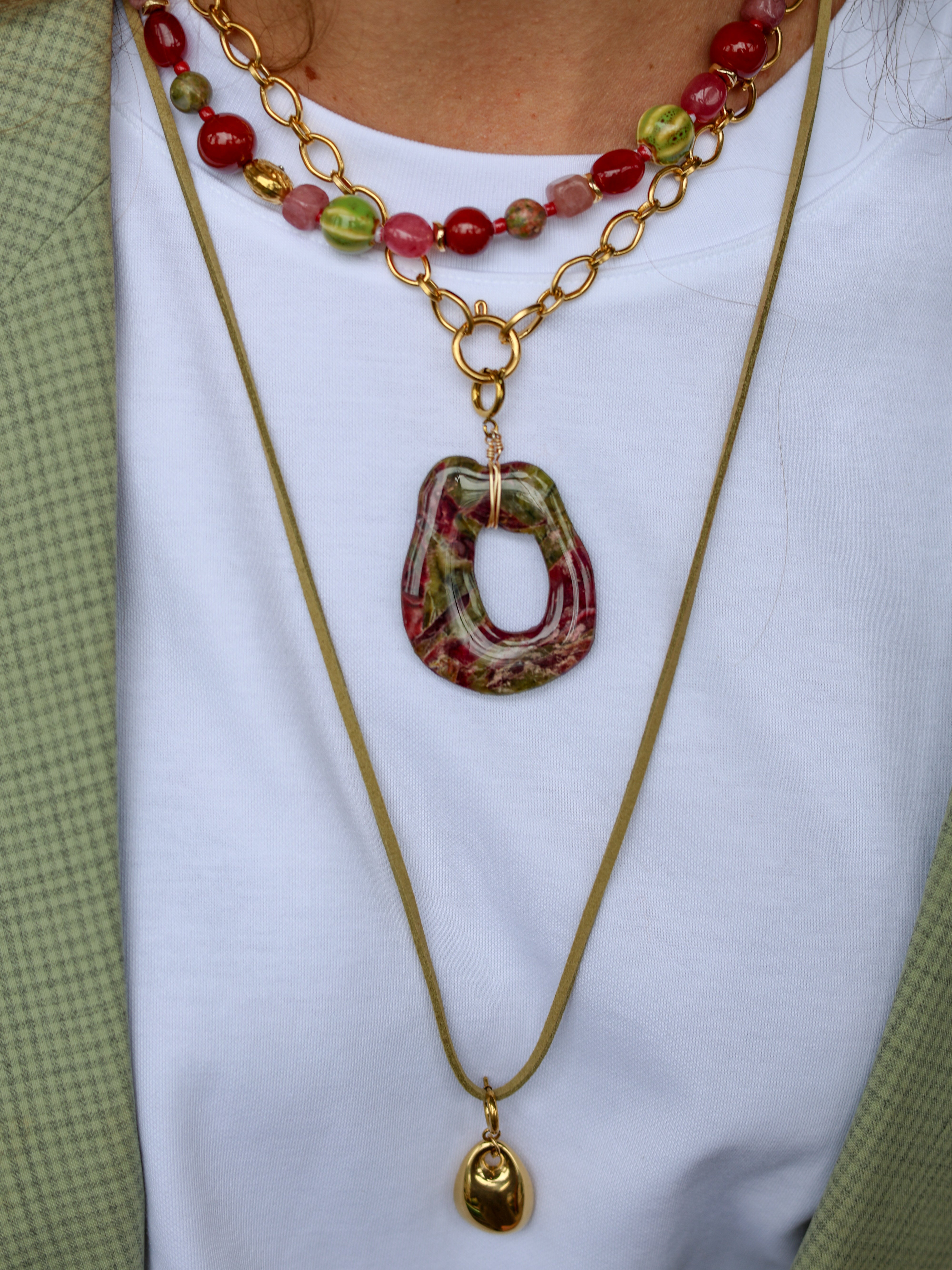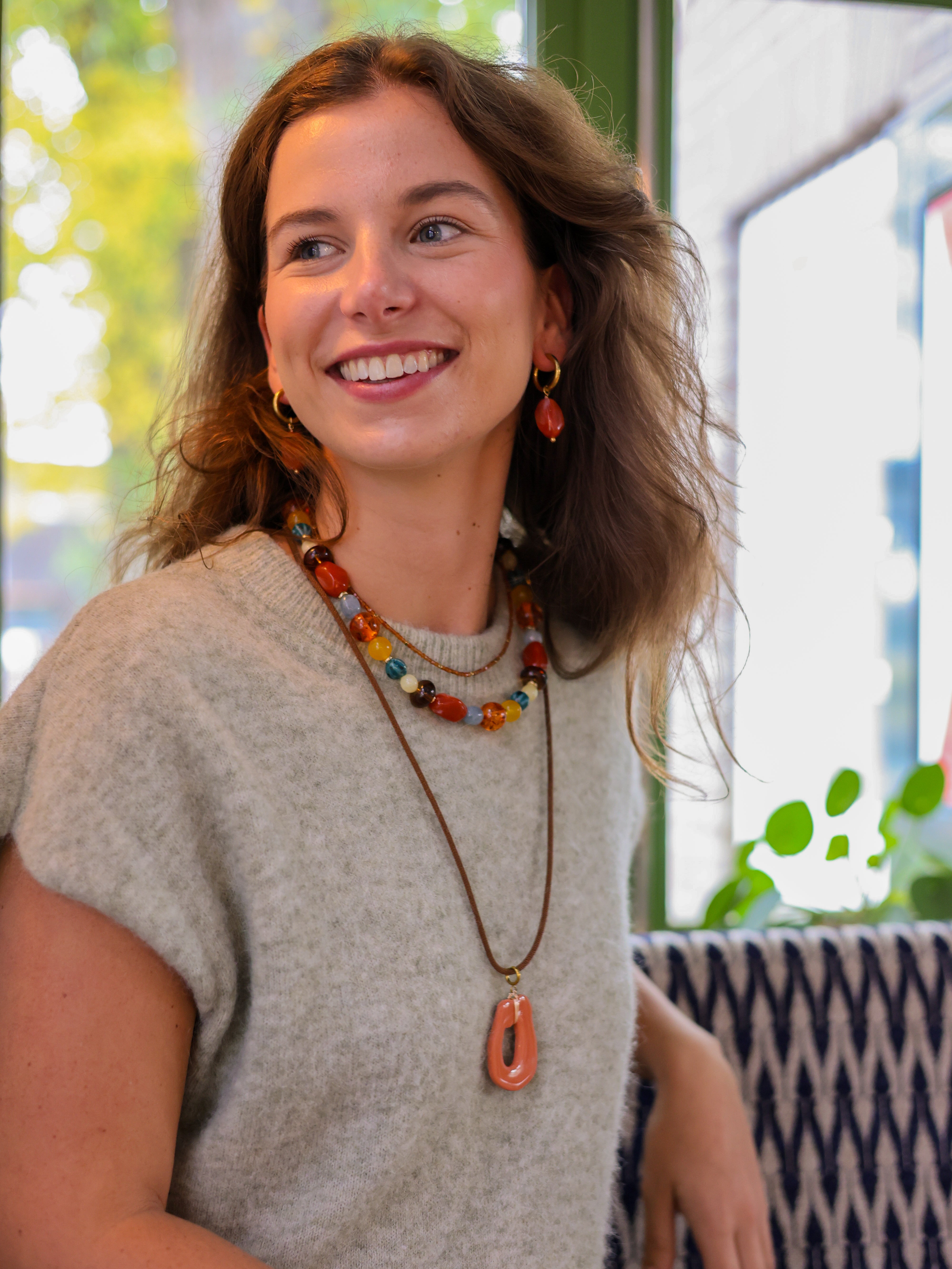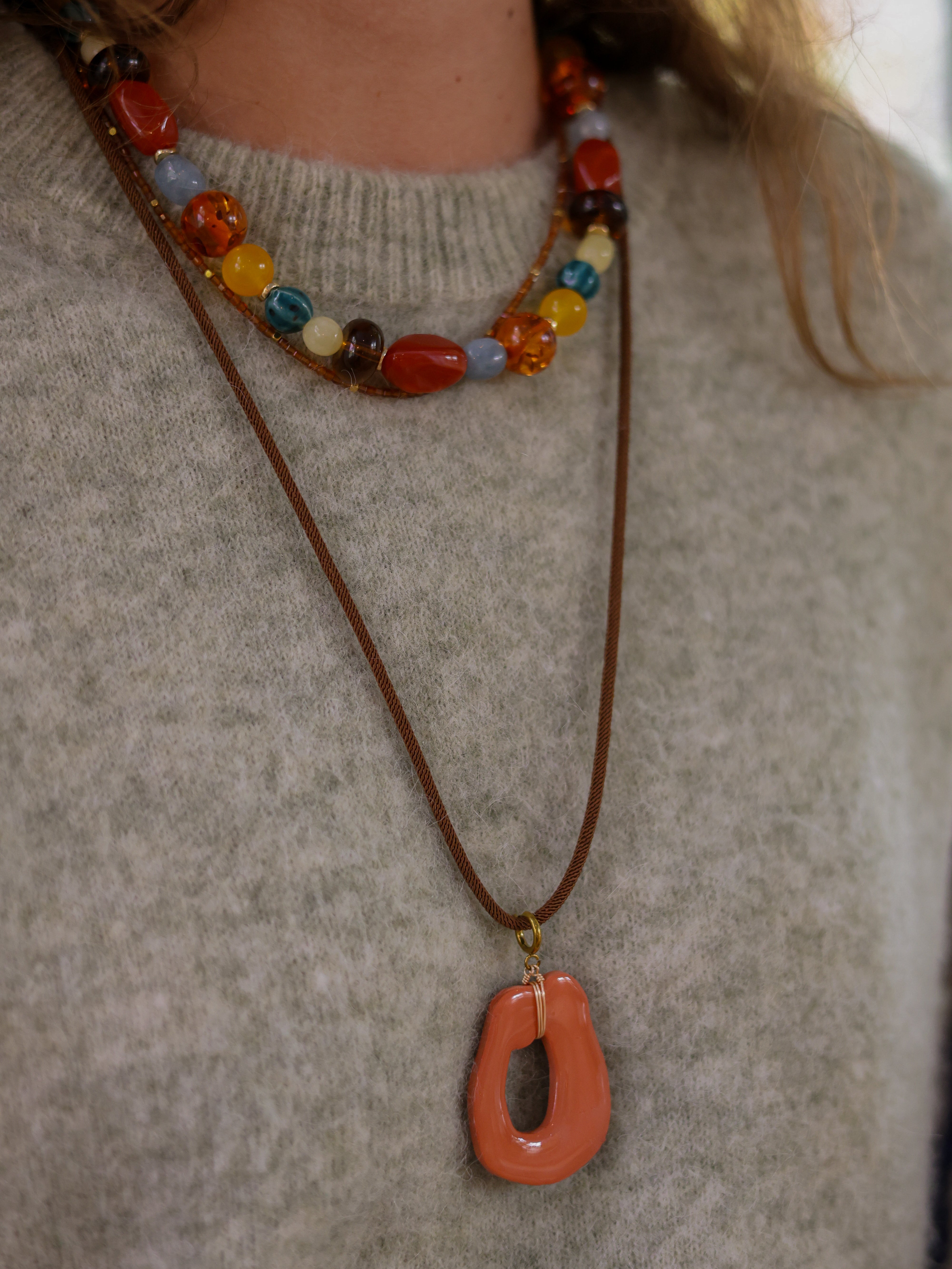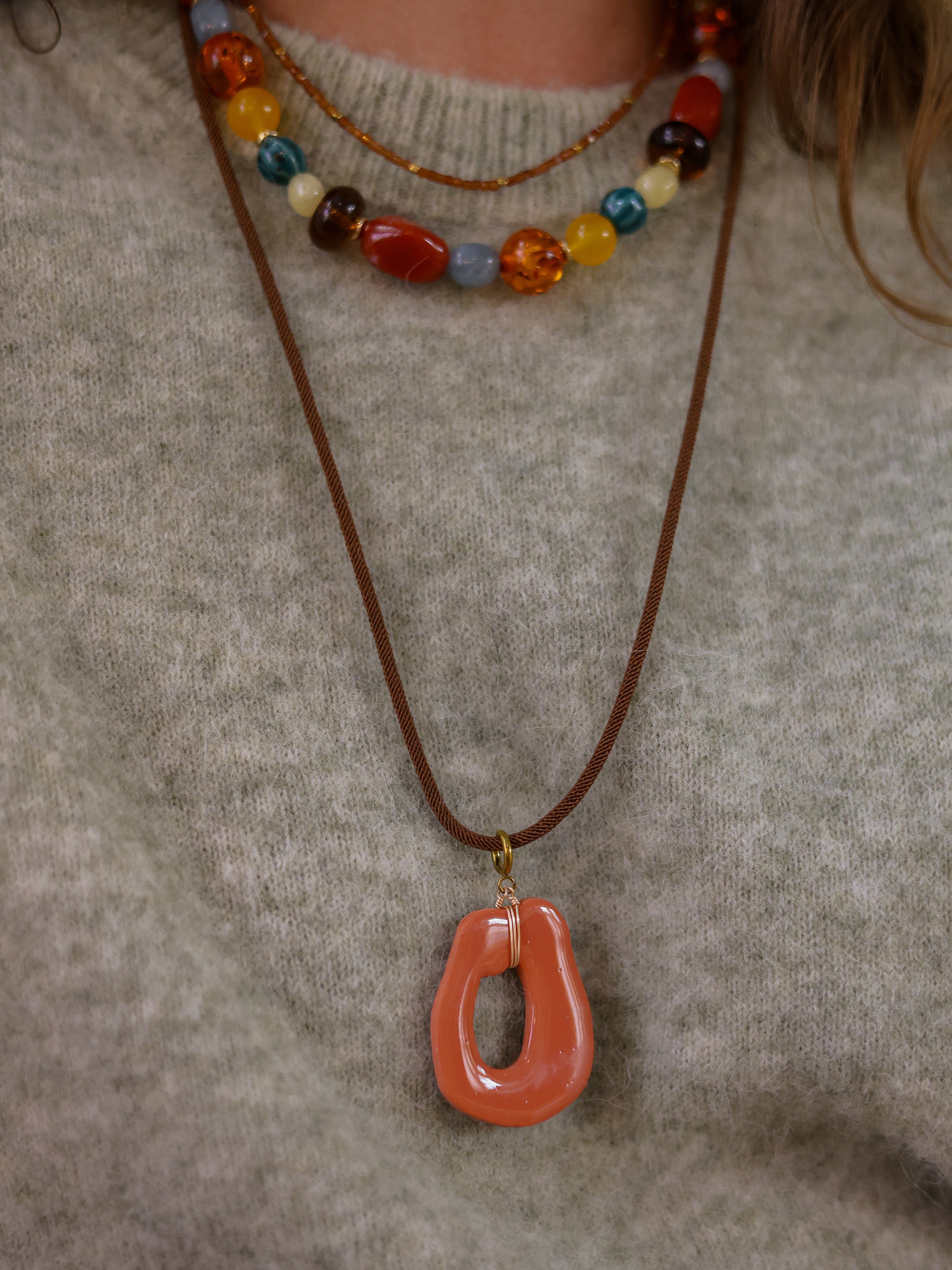 De Bold Frame is een handgemaakte kleihanger met organische vorm en glanzende afwerking. Elke hanger is anders — met subtiele marmerstructuren of effen kleuren die perfect harmoniëren met de herfsttinten van The Sculpt Edit. Draag hem aan een suede cord, rope of gouden ketting en creëer je eigen sculpted look.