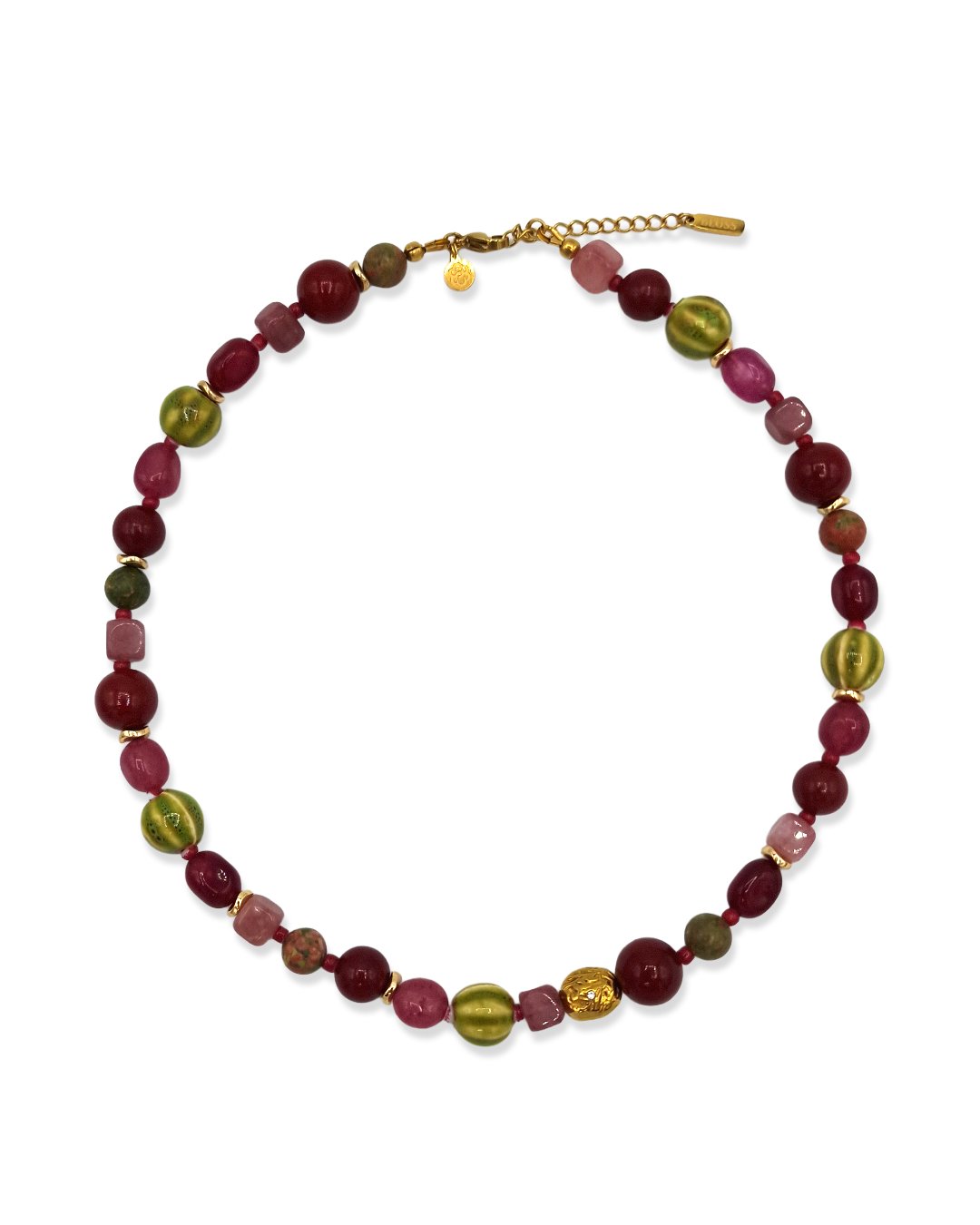 - Kleur: rood, roze, olijfgroen en goudkleurige accenten