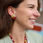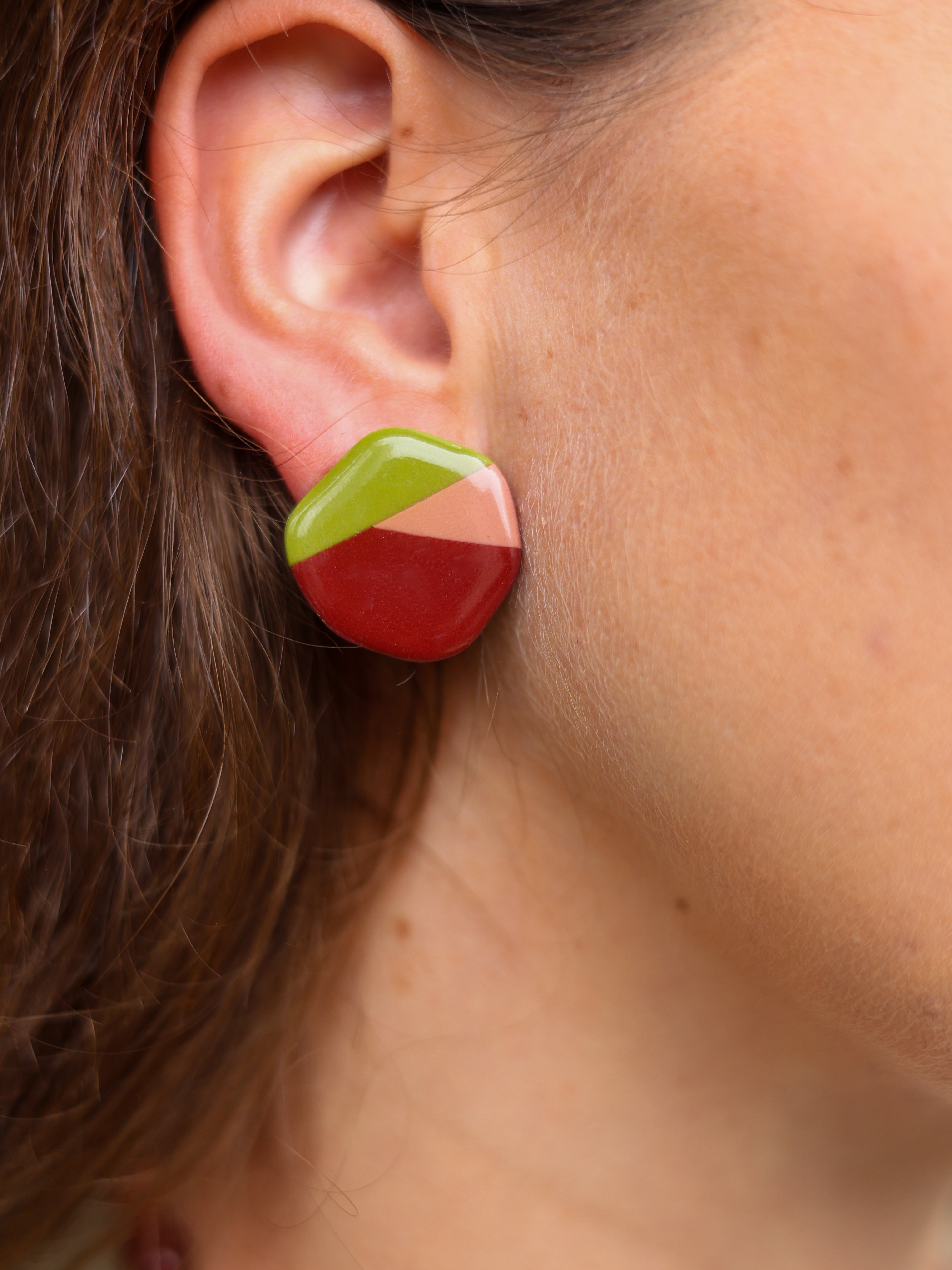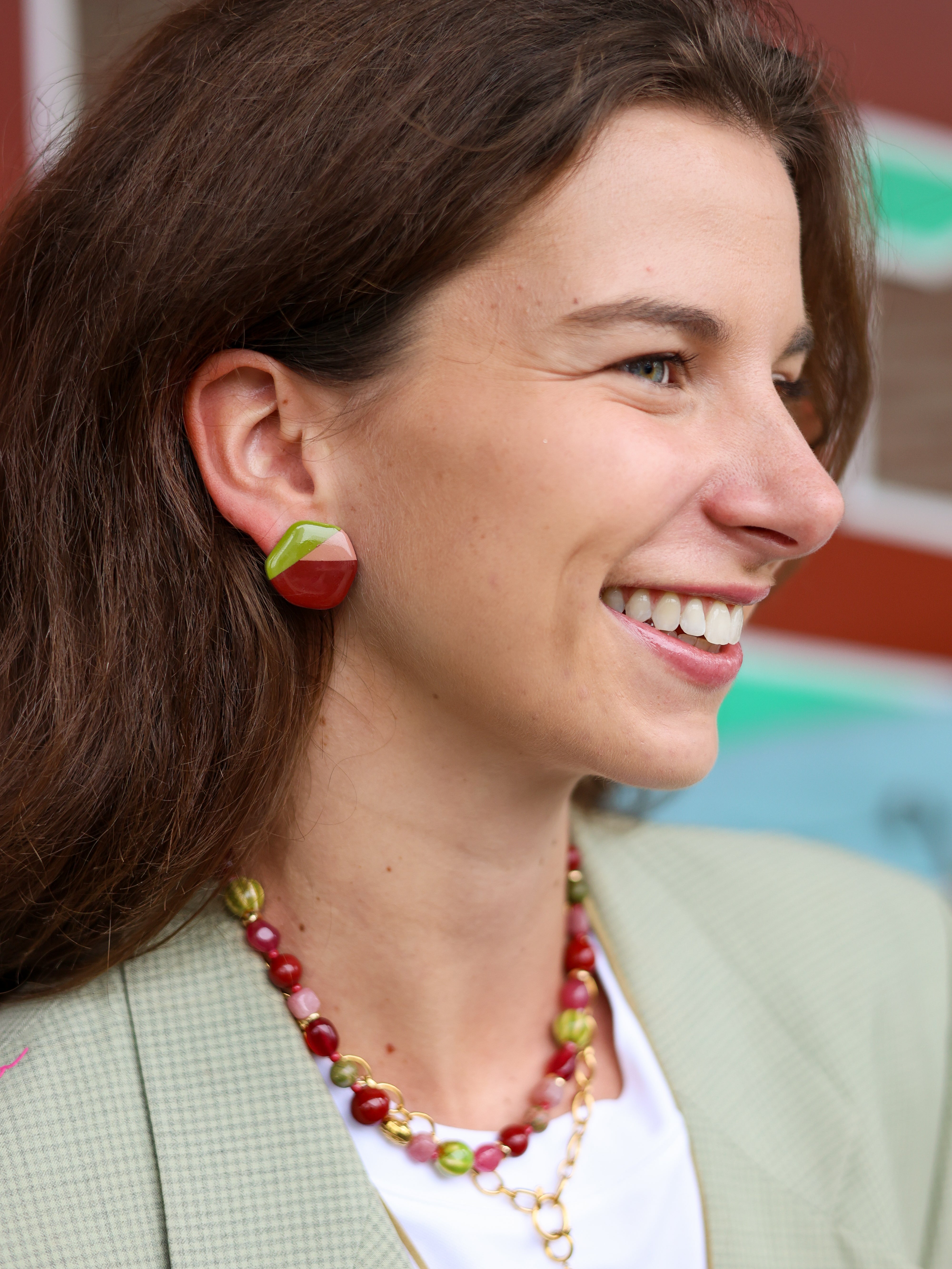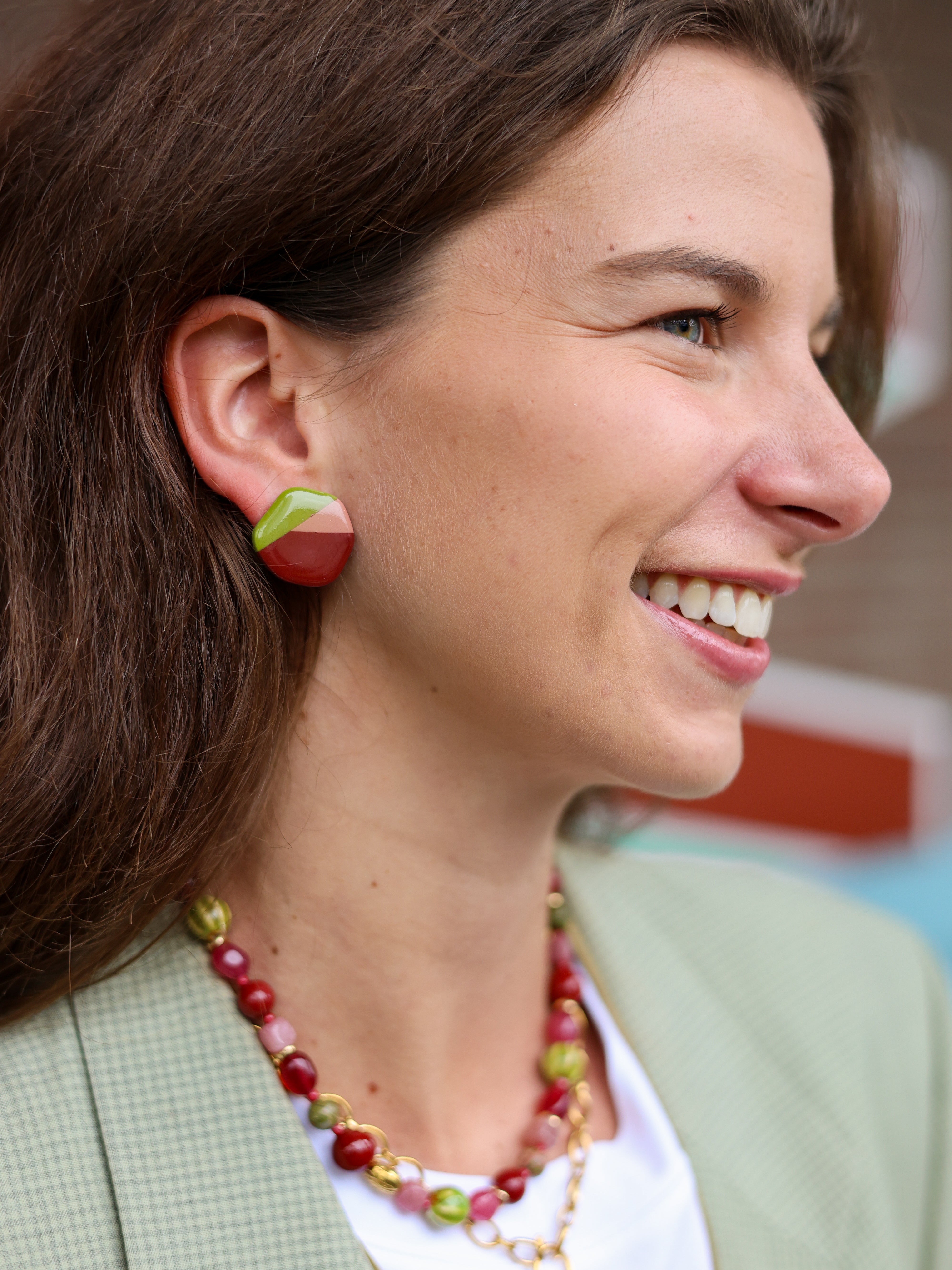 De Arch Drop combineren sculpturale lijnen met een opvallend kleurenspel. De combinatie van roze, merlot en olijfgroen geeft deze oorbellen een krachtige, eigentijdse uitstraling, perfect voor wie houdt van statement pieces die moeiteloos opvallen.