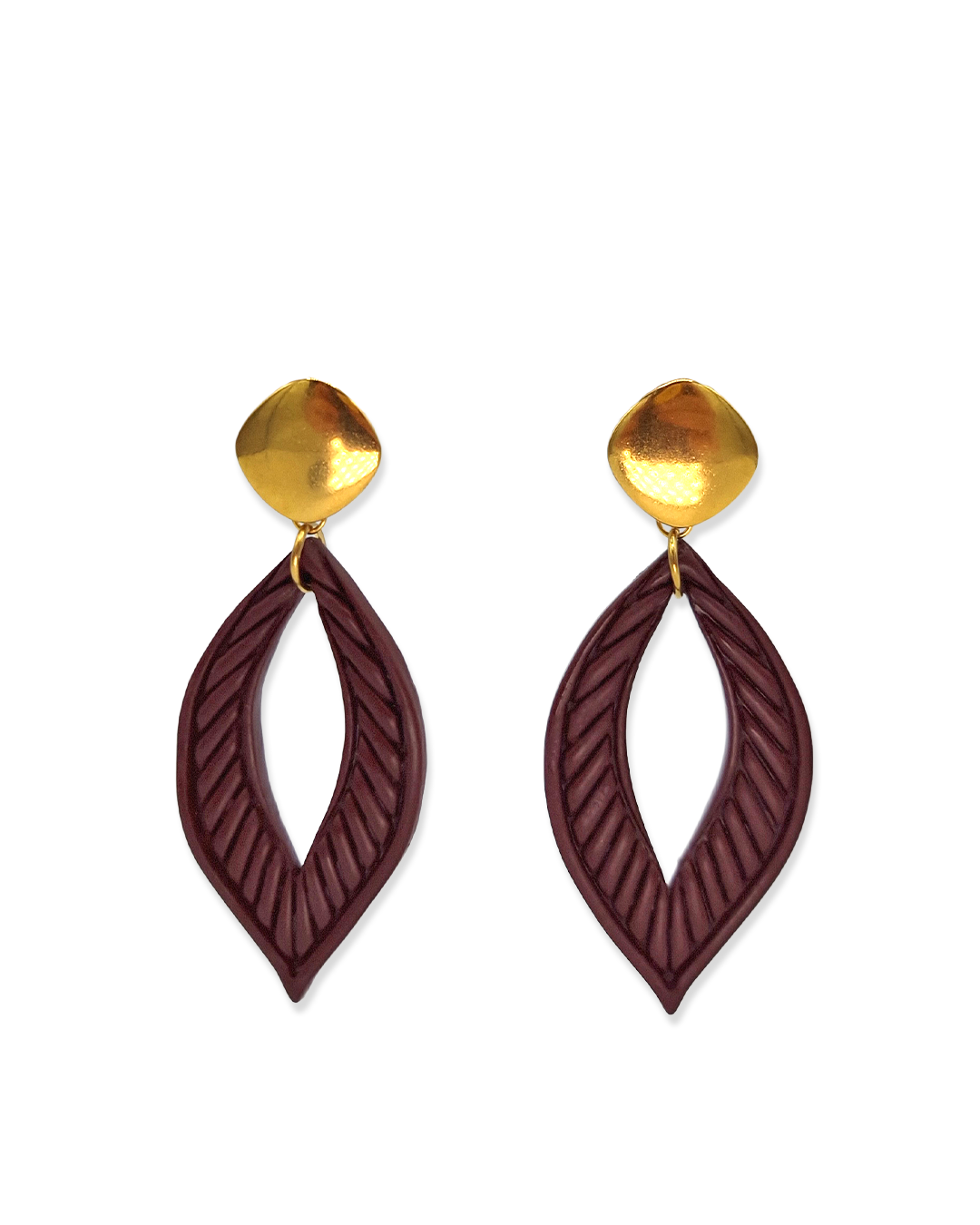 Diepe merlot tint, strakke vorm, duidelijke presence. Deze oorbellen zijn gemaakt van lichtgewicht klei en hebben een uitgesneden leaf drop die je look meteen richting geeft. De gold plated studs voegen warmte toe zonder te overheersen.