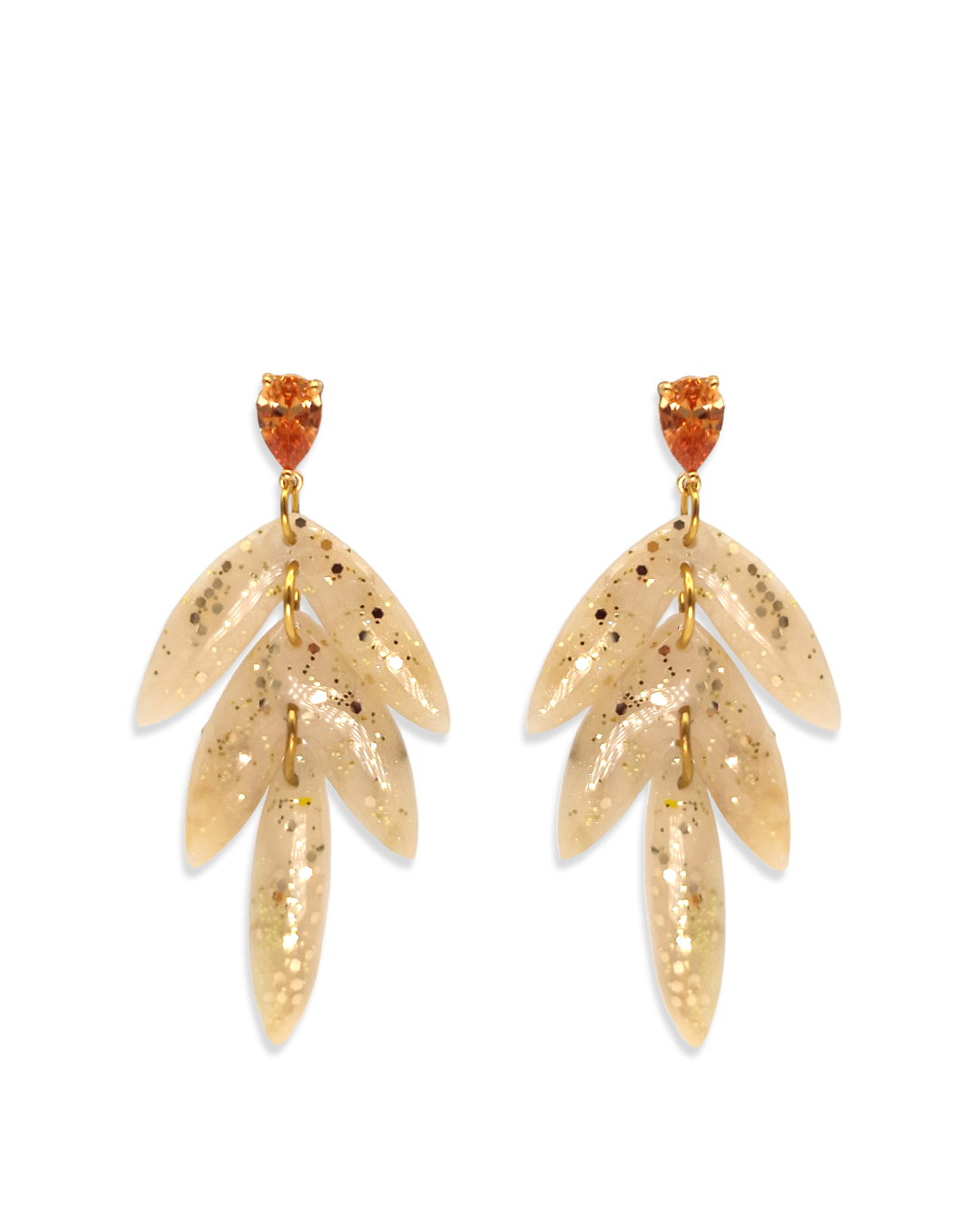 Deze oorbellen bewegen met je mee en trekken meteen de aandacht op de goede manier. De zachte peach tint met gouden glitter geeft een warme, feestelijke glans. De layered leaf vorm creëert beweging en maakt je look vrouwelijk, modern en zelfverzekerd. De glanzende peach top maakt het geheel nog sterker.